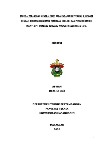 ASWAN, ASWAN (2020) STUDI ALTERASI DAN MINERALISASI PADA ENDAPAN EPITERMAL SULFIDASI RENDAH BERDASARKAN HASIL PEMETAAN GEOLOGI DAN PENGEBORAN RC DI PIT X PT. TAMBANG TONDANO NUSAJAYA SULAWESI UTARA = ALTERATION AND MINERALIZATION STUDY ON LOW SULFIDATION EPITERMAL DEPOSITS BASED ON THE RESULTS OF GEOLOGICAL MAPPING AND RC DRILLING AT PIT X PT. TAMBANG TONDANO NUSAJAYA NORTH OF SULAWESI. Skripsi thesis, Universitas Hasanuddin.