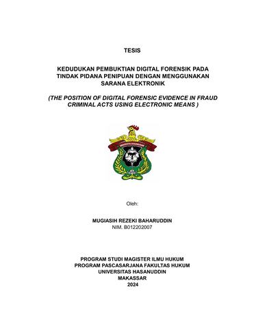 MUGIASIH REZEKI BAHARUDDIN (B012202007) dengan judul “Kedudukan Pembuktian Digital Forensik Pada Tindak Pidana Penipuan Menggunakan Sarana Elektronik”. (Dibimbing oleh Hijrah Adhiyanti Mirzana dan Audyna Mayasari Muin). Penelitian ini bertujuan untuk menganalisis 1) kedudukan digital forensik pada pembuktian tindak pidana penipuan menggunakan sarana elektronik, 2) penerapan pembuktian digital forensik di tingkat penyidikan pada tindak pidana penipuan menggunakan sarana elektronik. Metode penelitian yang digunakan dalam penelitian ini adalah tipe penelitian empiris yang merupakan penelitian hukum yang dilakukan dengan cara meneliti data primer dan sekunder, yaitu data yang diperoleh secara langsung dari masyarakat melalui studi lapangan dan studi pustaka. Melalui wawancara langsung dan pengumpulan bahan-bahan pustaka yang berkaitan dengan penelitian ini, selanjutnya data yang diperoleh akan dianalisa secara kualitatif dan disajikan secara deskriptif sebagaimana dengan penjelasan yang berkaitan dengan penelitian ini, kemudian menarik kesimpulan berdasarkan analisis yang penulis lakukan. Hasil penelitian menunjukkan (1) Pembuktian digital forensik dalam tindak pidana penipuan menggunakan sarana/media elektronik memiliki kedudukan yang sah dan penting dalam sistem hukum pidana di Indonesia. Pembuktian digital forensik tidak termasuk kedalam Alat bukti melainkan merupakan Sarana/media untuk menjelaskan bukti elektronik, hasil dari digital forensik tersebut dimasukkan kedalam bentuk alat bukti elektronik yang sah, akan tetapi dalam proses dilapangan untuk menunggu hasil identifikasi digital forensik terkadang membutuhkan waktu yang lama, sehingga perlu adanya pejabat dibawah sumpah ataupun pejabat yang memiliki kewenangan (Ahli) untuk menjelaskan. Sedangkan pada persidangan pembuktian digital forensik tidak dapat dikatakan sebagai alat bukti keterangan ahli sebab suatu pembuktian di persidangan yang dapat dikatakan alat bukti ialah sebagaimana yang tercantum dalam Pasal 184 KUHAP. (2) Penerapan pembuktian digital forensik pada tindak pidana penipuan elektronik di wilayah hukum polres gowa, dipengaruhi oleh faktor hukum yang mana peraturan perundang-undangan sendiri masih samar-samar dalam menjelaskan digital forensik sebagai pembuktian, sedang pada faktor penegak hukum penyidik tidak menuturkan terkait peraturan perundang-undangan apa saja yang telah dilaksanakan dalam penanganan kasus penipuan elektronik, faktor sarana atau fasilitas penyidik dalam menyelesaikan tindak pidana penipuan elektronik mengguanakan sarana atau fasilitsas seadanya, sehingga masih ada beberapa kasus yang belum terselesaikan atau tuntas, dikarenakan sebab masih belum merata atau lengkapnya fasilitas di wilayah hukum polres gowa.