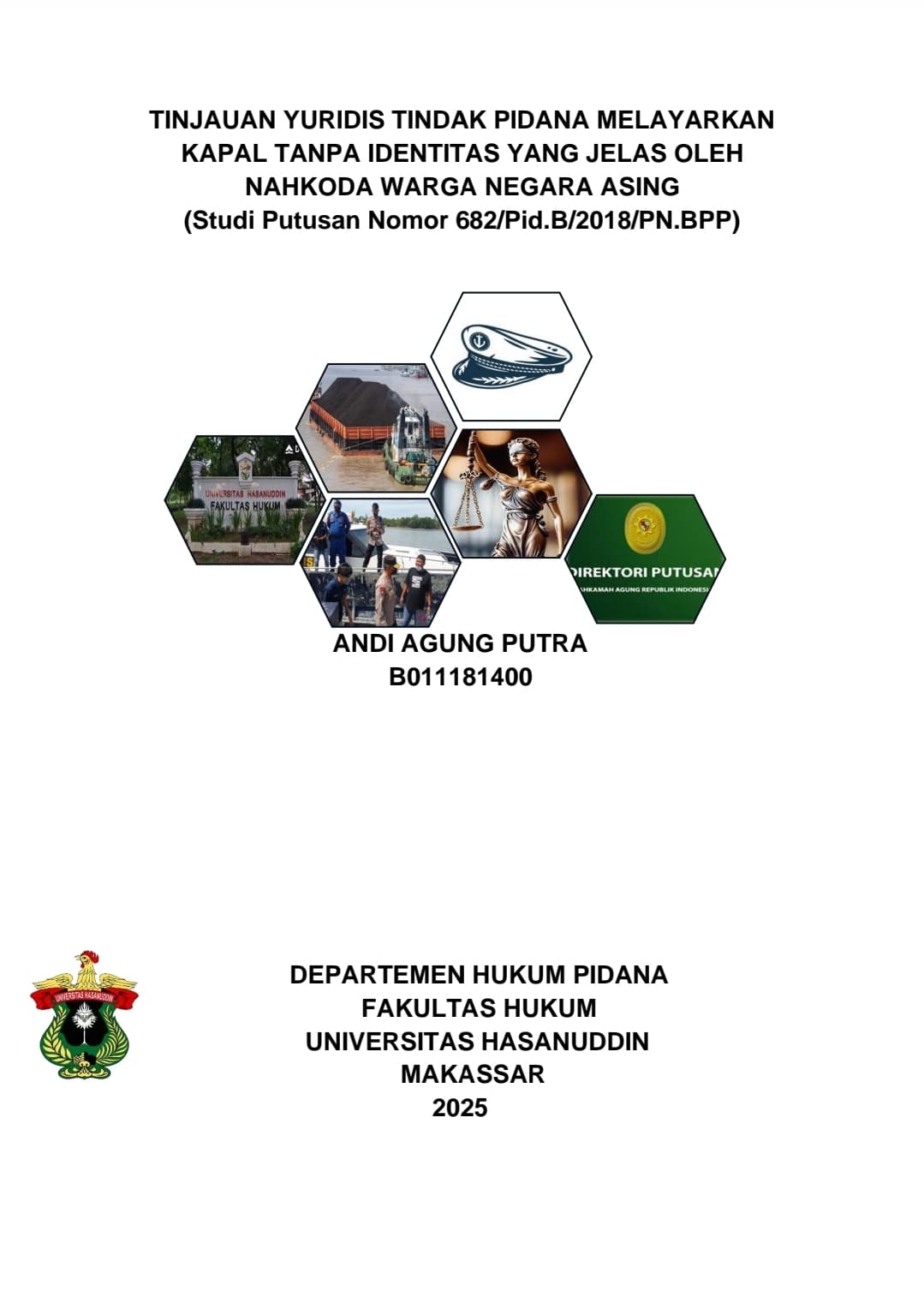 PUTRA, ANDI AGUNG (2024) TINJAUAN YURIDIS TINDAK PIDANA MELAYARKAN KAPAL TANPA IDENTITAS YANG JELAS OLEH NAHKODA WARGA NEGARA ASING (Studi Putusan Nomor 682/Pid.B/2018/PN.BPP) = JURIDICIAL REVIEW OF THE CRIME OF SAILING A SHIP WITHOUT A CLEAR IDENTITY BY THE CAPTAIN OF A FOREIGN CITIZEN (Decision Study Number 682/Pid.B/2018/PN.BPP). Skripsi thesis, Universitas Hasanuddin.