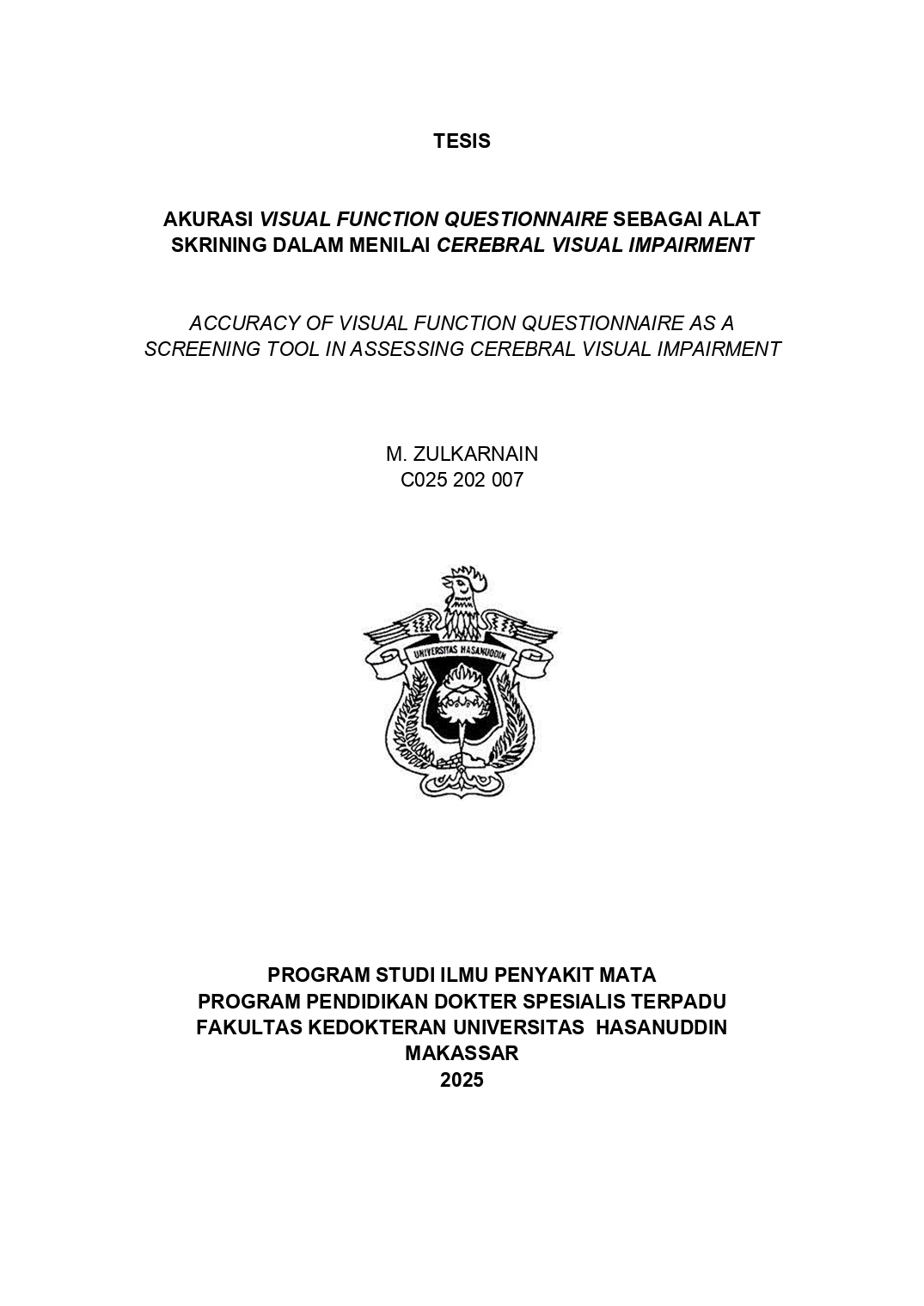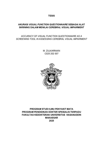 ZULKARNAIN, M. (2025) AKURASI VISUAL FUNCTION QUESTIONNAIRE SEBAGAI ALAT SKRINING DALAM MENILAI CEREBRAL VISUAL IMPAIRMENT = ACCURACY OF VISUAL FUNCTION QUESTIONNAIRE AS A SCREENING TOOL IN ASSESSING CEREBRAL VISUAL IMPAIRMENT. Thesis thesis, Universitas Hasanuddin.