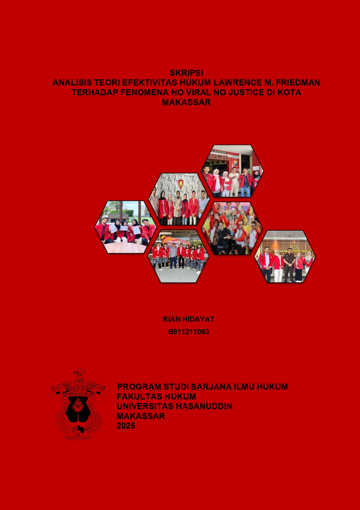 RIAN HIDAYAT. (B011211063). Analisis Teori Efektivitas Lawrence M. Friedmen Terhadap Fenomena No Viral No Justice Di Kota Makassar. Dibimbing oleh Kadarudin sebagai dosen pembimbing. Latar Belakang: Penegakan hukum di Indonesia dianggap efektif jika sesuai dengan prinsip demokrasi berlandaskan asas equality before the law. Namun, penerapannya masih belum optimal, terlihat dari munculnya fenomena no viral no justice menunjukkan ketidakefektifan penegakan hukum. Tujuan: Riset ini bertujuan untuk menganalisis kondisi legal structure, legal culture, dan legal substance untuk mengetahui penyebab munculnya fenomena no viral no justice menggunakan mixed method dengan pendekatan konvergen paralel. Metode: Penelitian ini menggunakan metode kualitatif dilakukan dengan teknik wawancara mendalam menggunakan teknik analisis data deskriptif argumentatif, sedangkan metode kuantitatif dilakukan dengan penyebaran kuesioner menggunakan teknik analisis data statistik deskriptif. Hasil: riset menunjukkan bahwa dari segi legal structure terdapat kekurangan kuantitas dan kualitas penyidik, sarana dan prasarana yang kurang memadai, dan minimnya sosialisasi kepada masyarakat mengenai prosedur penanganan tindak kejahatan. Sedangkan dari legal culture, kesadaran akan pentingnya melaporkan kejahatan berada di tingkat yang tinggi yaitu 93,25%. Namun, 79,75% lebih memilih melaporkannya melalui media sosial dibandingkan langsung kepada penegak hukum. Sementara dari segi legal substance, terdapat beberapa ketentuan yang belum diatur secara rinci dalam KUHAP yang memengaruhi munculnya fenomena no viral no justice. Kesimpulan: Dibutuhkan pengoptimalan pada sistem hukum meliputi aspek legal structure, legal culture, dan legal substance untuk menekan perkembangan fenomena no viral no justice sebagai upaya restorasi reputasi penegak hukum dalam masyarakat.