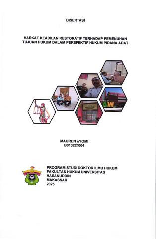 MAUREN AYOMI (B013221004). HARKAT KEADILAN RESTORATIF TERHADAP PEMENUHAN TUJUAN HUKUM DALAM PERSPEKTIF HUKUM PIDANA ADAT. Dibimbing oleh Andi Suriyaman M. Pide sebagai pembimbing utama dan Musakkir, M.Syukri Akub sebagai Pembimbing Pendamping. Penelitian ini bertujuan untuk mengkaji, menganalisis, dan menemukan hakikat serta konsep Restorative Justice dalam penyelesaian tindak pidana dengan menerapkan sanksi pidana adat dan mengintegrasikan konsep Restorative Justice dengan hukum pidana, guna memperbaiki sistem penyelesaian tindak pidana di Indonesia. Penelitian ini menggabungkan metode hukum normatif dan empiris. Hukum normatif digunakan untuk menganalisis aturan dan prinsip hukum, sementara hukum empiris memeriksa pelaksanaan nyata hukum adat dalam masyarakat. Penelitian ini bertujuan mengembangkan teori hukum baru dan memahami efektivitas hukum dalam praktik sosial. Restorative Justice dalam penyelesaian tindak pidana dengan sanksi pidana adat memfokuskan pada pemulihan keadaan semula bagi pelaku dan korban, melibatkan berbagai pihak. Konsep ini mewujudkan keadilan, kepastian, dan harmonisasi. Integrasi dengan hukum pidana mempercepat penyelesaian, namun tidak semua kasus dapat diselesaikan melalui Restorative Justice. Novelty atau temuan dari penelitian ini adalah integrasi konsep Restorative Justice dengan sanksi pidana adat dalam penyelesaian tindak pidana, yang menekankan pada pemulihan keadaan semula dan pelibatan berbagai pihak, serta mengakselerasi proses peradilan dengan asas sederhana, cepat, dan biaya ringan. Konsep ini memperbaiki keseimbangan kosmis dalam masyarakat dan mengharmonisasi hubungan sosial, meskipun tidak semua jenis tindak pidana dapat diselesaikan melalui pendekatan ini. Integrasi ini menawarkan solusi yang lebih cepat dan partisipatif dibandingkan dengan pendekatan hukum pidana konvensional.