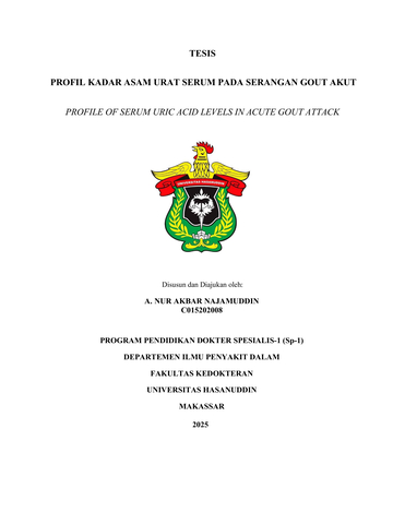 NAJAMUDDIN, A. NUR AKBAR (2025) PROFIL KADAR ASAM URAT SERUM PADA SERANGAN GOUT AKUT = PROFILE OF SERUM URIC ACID LEVELS IN ACUTE GOUT ATTACK. Thesis thesis, UNIVERSITAS HASANUDDIN.