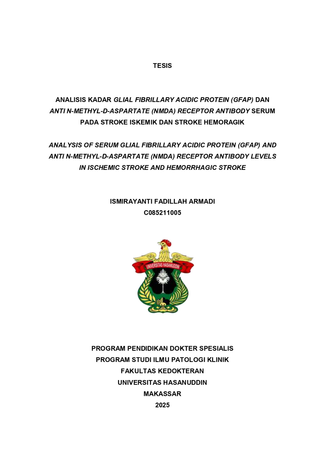 ARMADI, ISMIRAYANTI FADILLAH (2025) Analisis Kadar Glial Fibrillary Acidic Protein (GFAP) dan Anti N-Methyl-D-Aspartate (NMDA) Receptor Antibody Serum pada Stroke Iskemik dan Stroke Hemoragik = : Analysis of Glial Fibrillary Acidic Protein Levels and Serum Anti-N-Methyl-D-Aspartate Receptor Antibody in Ischemic and Hemorrhagic strokes: A Cross-Sectional Study. Thesis thesis, Universitas Hasanuddin.