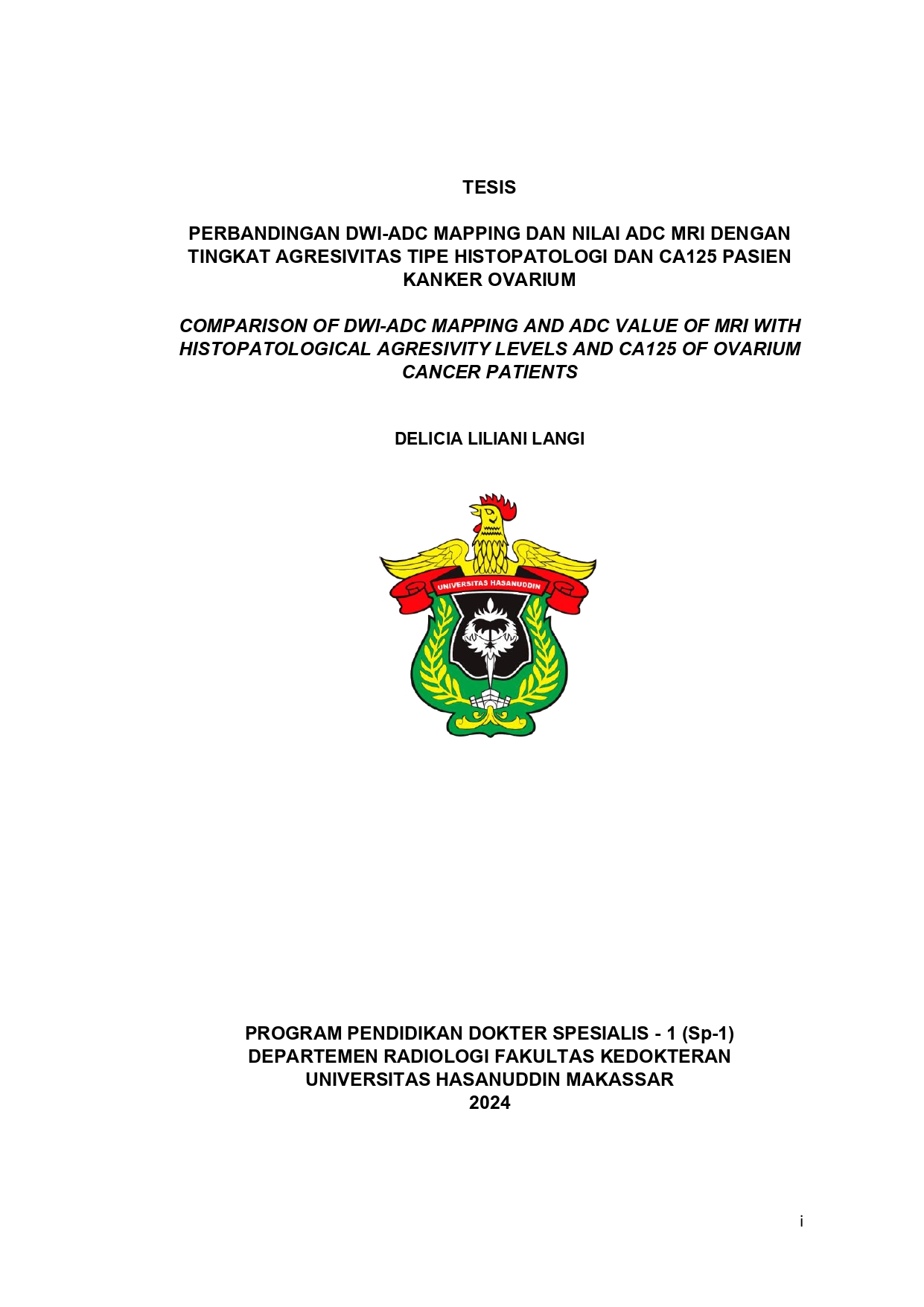 LANGI, DELICIA LILIANI (2024) PERBANDINGAN DWI-ADC MAPPING DAN NILAI ADC MRI DENGAN TINGKAT AGRESIVITAS TIPE HISTOPATOLOGI DAN CA125 PASIEN KANKER OVARIUM = COMPARISON OF DWI-ADC MAPPING AND ADC VALUE OF MRI WITH HISTOPATOLOGICAL AGRESIVITY LEVELS AND CA125 OF OVARIUM CANCER PATIENTS. Thesis thesis, Universitas Hasanuddin.