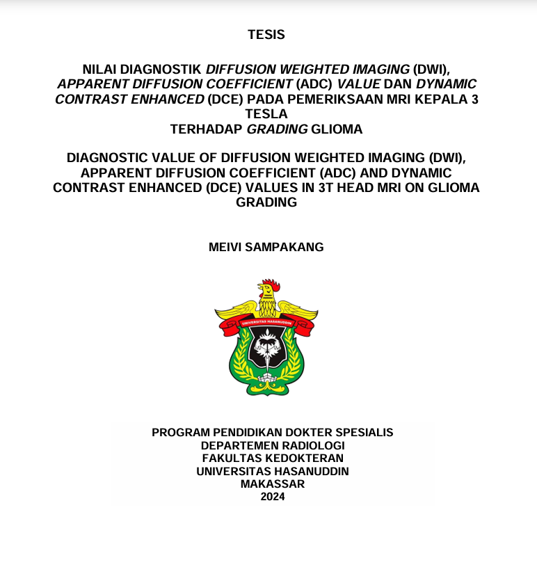SAMPAKANG, MEIVI (2024) Nilai diagnostik Diffusion Weighted Imaging (DWI), Apparent Diffusion Coefficient (ADC) value dan Dynamic Contrast Enhanced (DCE) pada Pemeriksaan MRI Kepala 3 Tesla terhadap Grading Glioma = Diagnostic Value of Diffusion Weighted Imaging (DWI), Apparent Diffusion Coefficient (ADC) and Dynamic Contrast Enhanced (DCE) Values in 3T head MRI on Glioma Grading. Thesis thesis, Universitas Hasanuddin.