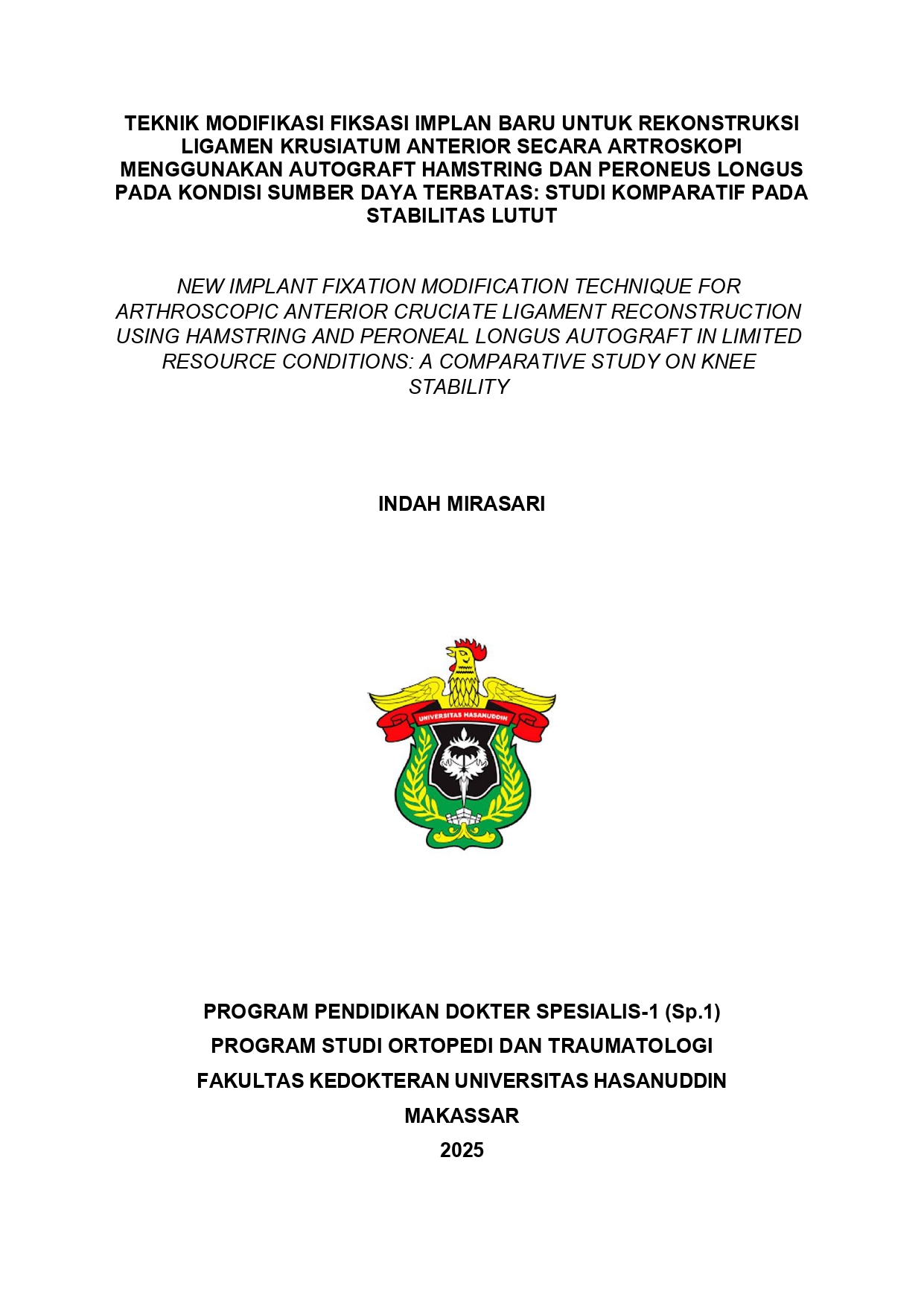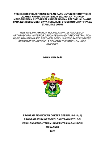 MIRASARI, INDAH (2025) Teknik Modifikasi Fiksasi Implan Baru untuk Rekonstruksi Ligamen Krusiatum Anterior secara Artroskopi Menggunakan Autograft Hamstring dan Peroneus Longus pada Kondisi Sumber Daya Terbatas: Studi Komparatif pada Stabilitas Lutut = Novel Modified Implant Fixation Technique for Arthroscopic Anterior Cruciate Ligament Reconstruction Using Hamstring and Peroneus Longus Autografts in Limited Resource Settings: A Comparative Study on Knee Stability. Thesis thesis, Universitas Hasanuddin.