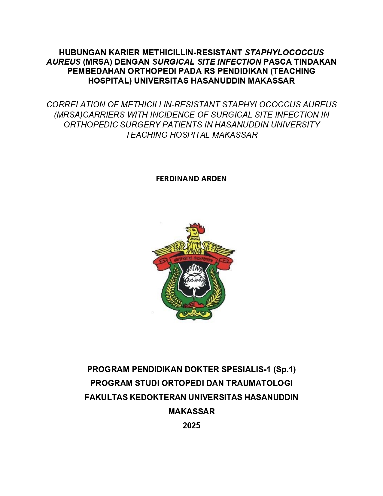 ARDEN, FERDINAND (2025) Hubungan Karier Methicillin-Resistant Staphylococcus aureus (MRSA) dengan Surgical Site Infection Pasca Tindakan Pembedahan Orthopedi pada RS Pendidikan (Teaching Hospital) Universitas Hasanuddin Makassar = Correlation of Methicillin-Resistant Staphylococcus aureus (MRSA) Carriers with Incidence of Surgical Site Infection In Orthopedic Surgery Patients in Hasanuddin University Teaching Hospital Makassar. Thesis thesis, Universitas Hasanuddin.