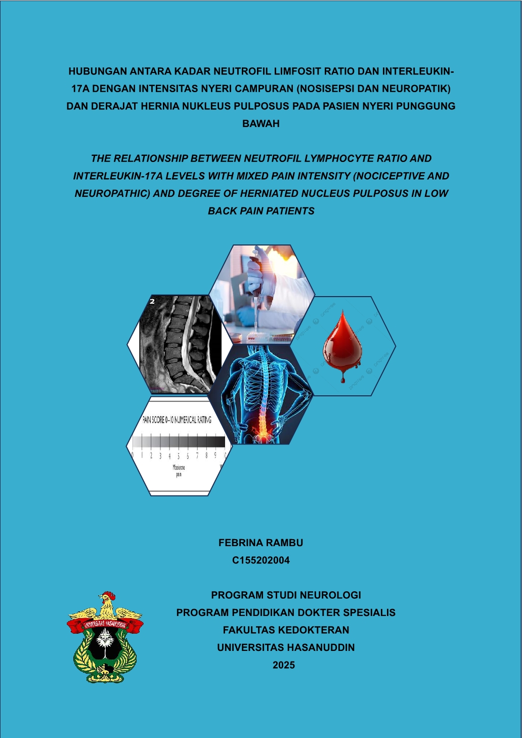 RAMBU, FEBRINA (2025) HUBUNGAN ANTARA KADAR NEUTROFIL LIMFOSIT RATIO DAN INTERLEUKIN-17A DENGAN INTENSITAS NYERI CAMPURAN (NOSISEPSI DAN NEUROPATIK) DAN DERAJAT HERNIA NUKLEUS PULPOSUS PADA PASIEN NYERI PUNGGUNG BAWAH = THE RELATIONSHIP BETWEEN NEUTROFIL LYMPHOCYTE RATIO AND INTERLEUKIN-17A LEVELS WITH MIXED PAIN INTENSITY (NOCICEPTIVE AND NEUROPATHIC) AND DEGREE OF HERNIATED NUCLEUS PULPOSUS IN LOW BACK PAIN PATIENTS ). Thesis thesis, Universitas Hasanuddin.