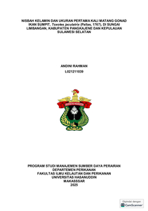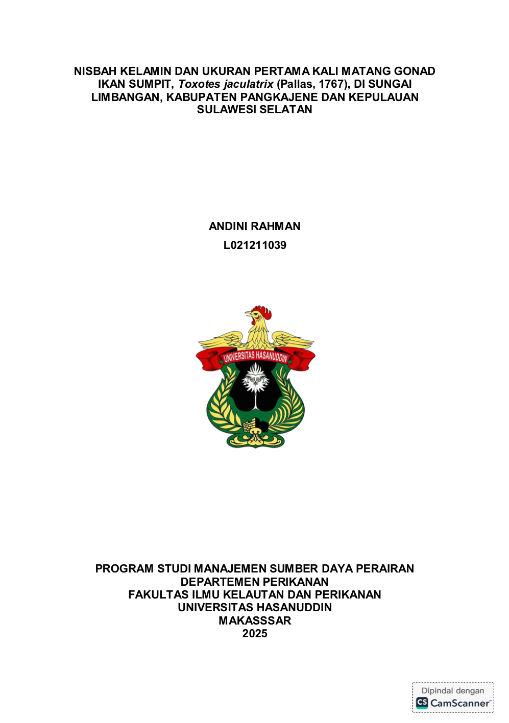 RAHMAN, ANDINI (2025) Nisbah Kelamin dan Ukuran Pertama Kali Matang Gonad Ikan Sumpit, Toxotes jaculatrix (pallas, 1767), di Sungai Limbangan. Kabupaten Pangkajene dan Kepulauan, Sulawesi Selatan. = Sex Ratio and Size at First Gonadal Maturity of the Archerfish, Toxotes jaculatrix (Pallas, 1767) in Limbangan River, Pangkajene and Kepulauan, South Sulawesi. Skripsi thesis, Universitas Hasanuddin.