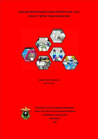 Nurul Safitri Saleh L014201037. ANALISIS KEUNTUNGAN USAHA EKSPOR HASIL LAUT PADA PT. MITRA TIMUR NUSANTARA” dibimbing oleh Sri Suro Adhawati sebagai pembimbing utama dan Sitti Fakhriyyah sebagai pembimbing anggota. Penelitian ini bertujuan untuk mengetahui proses produksi, mengetahui prosedur ekspor usaha hasil laut, dan untuk mengetahui besarnya kentungan usaha ekspor hasil laut pada PT. MTN di Kota Makassar. PT. MTN merupakan salah satu perusahaan yang bergerak di bidang perikanan dan hasil laut dengan fokus utama pada ekspor berbagai jenis produk laut seperti ikan dan sotong. Penelitian ini menggunakan metode kuantitatif dengan menganalisis proses produksi, prosedur ekspor dan keuntungan penjualan yang dihasilkan dari aktivitas ekspor selama periode tertentu. Hasil penelitian menunjukkan bahwa PT. MTN berhasil memperoleh keuntungan yang signifikan dari ekspor hasil laut, meskipun terdapat tantangan dari segi biaya operasional dan perubahan harga di pasar internasional. Keuntungan usaha yang di dapatkan oleh PT. MTN di Kota Makassar pada usaha ekspor hasil laut sebesar Rp 6,944,242,361/tahun yang menandakan bahwa nilai keuntungan tersebut lebih besar dari total biaya yang dikeluarkan