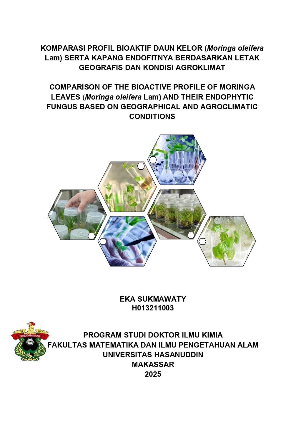 SUKMAWATY, EKA (2025) KOMPARASI PROFIL BIOAKTIF DAUN KELOR (Moringa oleifera Lam) SERTA KAPANG ENDOFITNYA BERDASARKAN LETAK GEOGRAFIS DAN KONDISI AGROKLIMAT = COMPARISON OF THE BIOACTIVE PROFILE OF MORINGA LEAVES (Moringa oleifera Lam) AND THEIR ENDOPHYTIC FUNGUS BASED ON GEOGRAPHICAL AND AGROCLIMATIC CONDITIONS. Disertasi thesis, Universitas Hasanuddin.