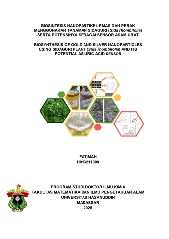 FATIMAH, FATIMAH (2025) BIOSINTESIS NANOPARTIKEL EMAS DAN PERAK MENGGUNAKAN TANAMAN SIDAGURI (Sida rhombifolia) SERTA POTENSINYA SEBAGAI SENSOR ASAM URAT = BIOSYNTHESIS OF GOLD AND SILVER NANOPARTICLES USING SIDAGURI PLANT (Sida rhombifolia) AND ITS POTENTIAL AS URIC ACID SENSOR. Disertasi thesis, Universitas Hasanuddin.
