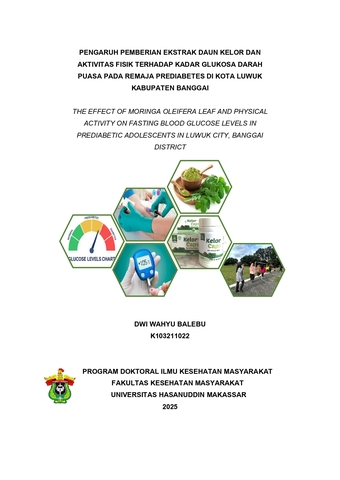 ABSTRAK DWI WAHYU BALEBU. Pengaruh Pemberian Ekstrak Daun Kelor dan Aktivitas Fisik terhadap Kadar Glukosa Darah Puasa pada Remaja Prediabetes di Kota Luwuk Kabupaten Banggai. (Dibimbing Oleh Ridwan Amiruddin, Nurhaedar Jafar dan A. Arsunan Arsin) Latar Belakang. Prediabetes adalah kondisi metabolik di mana kadar glukosa darah seseorang lebih tinggi dari normal, tetapi belum cukup tinggi untuk didiagnosis sebagai diabetes tipe 2. Tujuan. Penelitian ini bertujuan untuk menganalisis pengaruh pemberian ekstrak daun kelor (Moringa oleifera) dan aktivitas fisik terhadap kadar glukosa darah pada remaja dengan kondisi prediabetes. Metode. Desain penelitian ini adalah open-laber clinical trial dengan rancangan pretest-posttest menggunakan kelompok kontrol. Sebanyak 70 remaja prediabetes dibagi menjadi dua kelompok. Intervensi penelitian ini melalui pemberian ekstrak daun kelor 1000mg/hari dan melakukan aktivitas fisik jalan kaki ringan 4kali/minggu, serta kelompok kontrol yang hanya menjalankan aktivitas fisik saja. Pengukuran kadar glukosa darah, tekanan darah sistolik dan diastolik, IMT, dan lingkar perut dilakukan sebelum dan setelah intervensi selama 28 hari. Hasil Penelitian. Hasil penelitian menunjukkan bahwa terdapat penurunan signifikan kadar glukosa darah pada kelompok intervensi dibandingkan kelompok kontrol (p < 0,05). Hal ini menunjukkan bahwa kombinasi ekstrak daun kelor dan aktivitas fisik 2 kali lebih berpotensi efektif dalam menurunkan kadar glukosa darah, yang penting dalam pencegahan perkembangan prediabetes menjadi diabetes tipe 2. Kesimpulan. Penelitian ini mendukung penggunaan ekstrak daun kelor sebagai suplemen herbal yang potensial dalam pengendalian kadar glukosa darah, khususnya jika dikombinasikan dengan aktivitas fisik. Penelitian ini memberikan dasar ilmiah bagi strategi pencegahan prediabetes pada remaja melalui pendekatan alami yang terjangkau secara ekonomi dan mudah diterapkan.
