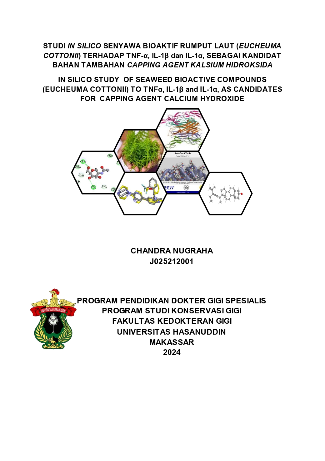 NUGRAHA, CHANDRA (2025) STUDI IN SILICO SENYAWA BIOAKTIF RUMPUT LAUT (EUCHEUMA COTTONII) TERHADAP TNF-α, IL-1β dan IL-1α, SEBAGAI KANDIDAT BAHAN TAMBAHAN DIRECT CAPPING AGENT KALSIUM HIDROKSIDA. Skripsi thesis, Universitas Hasanuddin.