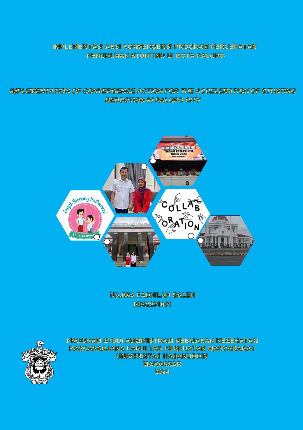 NAJWA FADHILAH SALEH Implementasi Aksi Konvergensi Percepatan Penurunan Stunting di Kota Palopo (dibimbing oleh Dr. Balqis, SKM., M.Sc.PH.,M.Kes dan Prof. Dr. Darmawansyah, SE.,MS) Latar Belakang. Trend kejadian stunting pada tingkat global sejak tahun 2000-2022 mengalami penurunan namun, WHO masih mengkategorikan Indonesia sebagai negara dengan prevalensi stunting yang sangat tinggi. Penurunan trend stunting global terjadi karena, keberhasilan implementasi intervensi konvergen secara multisektoral di berbagai negara. Pendekatan multisektor dan multipihak merupakan salah satu bentuk pendekatan dalam pelaksanaan Aksi Nasional Percepatan Penurunan Stunting. Tujuan. Penelitian ini bertujuan untuk menganalisis bagaimana implementasi aksi konvergensi percepatan penurunan stunting di Kota Palopo. Metode. Jenis penelitian yang digunakan adalah kualitatif dengan metode In-Depth Interview terhadap 14 Informan dari OPD yang berbeda yang tergabung dalam Tim TPPS Kota Palopo. Hasil. Penelitian ini menujukkan pada kondisi awal, setiap OPD memahami pentingnya partisipasi lintas sektor, namun terdapat tantangan dalam pemanfaatan sumber daya manusia dan penganggaran. Proses kolaborasi memerlukan perbaikan karena perencanaan, struktur tata kelola, dan peran aktor belum optimal, dengan beberapa OPD yang masih kurang memahami peran mereka. Kepemimpinan di Kota Palopo melibatkan regulasi dan komunikasi, namun beberapa OPD belum memiliki SOP dan regulasi tertentu, meskipun komunikasi antar OPD berjalan cukup efektif. Output penanganan stunting berfokus pada aspek kesehatan, pendidikan, infrastruktur, dan kesejahteraan sosial, dengan beberapa program yang terintegrasi langsung dan lainnya yang mendukung secara tidak langsung.Kesimpulan.Implementasi aksi konvergensi percepatan penurunan stunting di Kota Palopo belum optimal, dengan tantangan utama dalam pemanfaatan sumber daya manusia dan penganggaran. Proses kolaborasi, kepemimpinan, dan output program masih memerlukan perbaikan, terutama dalam hal perencanaan, struktur tata kelola, dan komunikasi antar OPD.