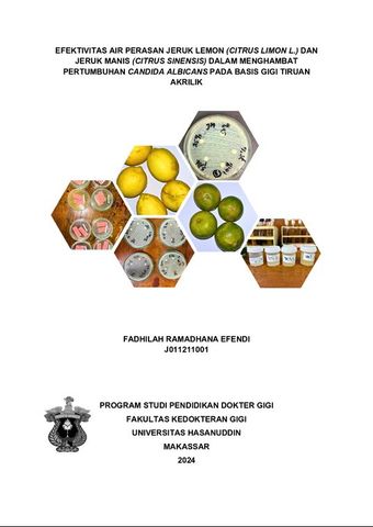 EFENDI, FADHILAH RAMADHANA (2024) Efektivitas Air Perasan Jeruk Lemon (Citrus limon L.) dan Air Perasan Jeruk Manis (Citrus Sinensis) Dalam Menghambat Pertumbuhan Candida albicans pada Basis Gigi Tiruan Akrilik = The Effectiveness of Lemon Juice (Citrus limon L.) and Sweet Orange Juice (Citrus sinensis) in Inhibiting the Growth of Candida albicans on Acrylic Denture Base. Skripsi thesis, Universitas Hasanuddin.