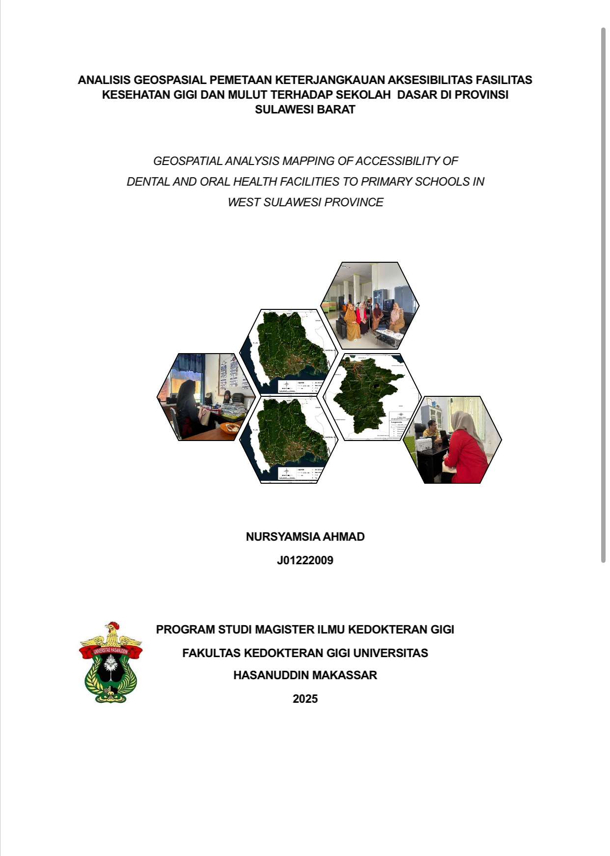 Analisis Geospasial Pemetaan Aksesbilitas terhadap Fasilitas kesehatan gigi dan mulut pada anak sekolah dasar di provinsi sulawesi barat (dibimbing oleh Prof. Dr. Rasmidar Samad, drg.M.,S.,FISDPH FISDP dan Irfan Sugianto, drg., M.Med., Ph.D.,Sp.RKG) Pendahuluan: Aksesibilitas fasilitas kesehatan gigi dan mulut sangat penting untuk mendukung kesehatan anak usia sekolah dasar. Faktor-faktor yang mempengaruhi aksesibilitas mencakup infrastruktur jalan, distribusi fasilitas kesehatan, dan karakteristik geografis. Tujuan: Penelitian ini bertujuan untuk menganalisis keterjangkauan dan aksesibilitas layanan kesehatan gigi dan mulut bagi anak sekolah dasar di Provinsi Sulawesi Barat, serta mengkontekstualisasikan pengaruh sosio-demografi terhadap layanan di daerah pesisir dan pegunungan.Metodologi: Desain penelitian menggunakan pendekatan deskriptif kuantitatif dengan analisis geospasial, melibatkan data dari BPS, wawancara dengan pegawai dinas kesehatan dan pendidikan, serta observasi kondisi sosial masyarakat. Hasil: Persebaran fasilitas kesehatan gigi dan mulut tidak merata; daerah pesisir memiliki akses yang lebih baik dibandingkan daerah pegunungan. Ketidakmerataan ini dipengaruhi oleh topografi berbukit-bukit, infrastruktur jalan yang terbatas, dan kondisi demografi masyarakat. Akibatnya, masyarakat di daerah terpencil sering kali harus menempuh perjalanan jauh untuk mendapatkan layanan kesehatan, sehingga lebih mengandalkan pengobatan tradisional atau menunda perawatan. Kesimpulan: Penelitian ini menegaskan bahwa kondisi sosio-demografi, termasuk topografi, sebaran fasilitas kesehatan, aksesibilitas, jenis pekerjaan, pendapatan, dan budaya masyarakat, berpengaruh signifikan terhadap tingkat pelayanan dan kesehatan gigi dan mulut di Provinsi Sulawesi Barat.