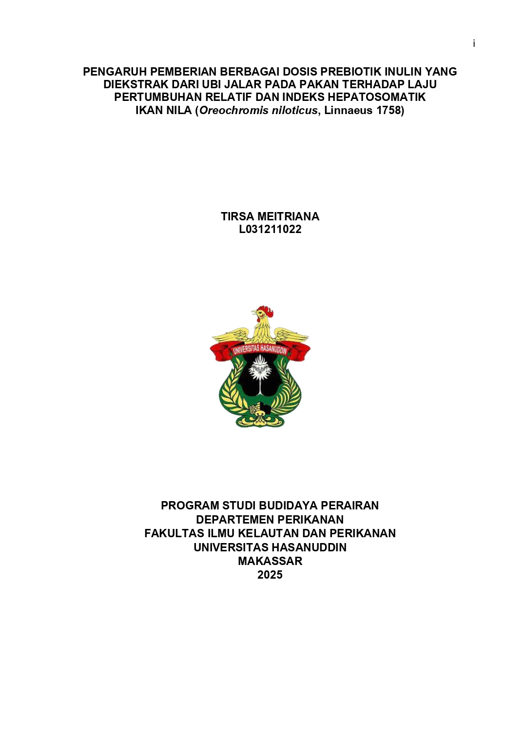 MEITRIANA, TIRSA (2025) PENGARUH PEMBERIAN BERBAGAI DOSIS PREBIOTIK INULIN YANG DIEKSTRAK DARI UBI JALAR PADA PAKAN TERHADAP LAJU PERTUMBUHAN RELATIF DAN INDEKS HEPATOSOMATIK IKAN NILA (Oreochromis niloticus, Linnaeus 1758) = THE EFFECT OF VARIOUS DOSES OF PREBIOTIC INULIN EXTRACTED FROM SWEET POTATOES IN FEED ON THE RELATIVE GROWTH RATE AND HEPATOSOMATIC INDEX OF TILAPIA (Oreochromis niloticus, Linnaeus 1758). Skripsi thesis, Universitas Hasanuddin.
