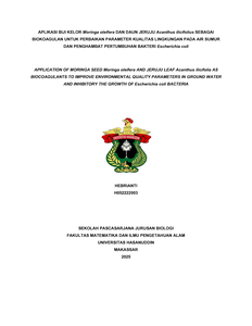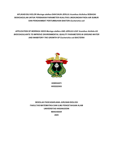 HEBRIANTI, HEBRIANTI (2025) APLIKASI BIJI KELOR Moringa oleifera DAN DAUN JERUJU Acanthus ilicifolius SEBAGAI BIOKOAGULAN UNTUK PERBAIKAN PARAMETER KUALITAS LINGKUNGAN PADA AIR SUMUR DAN PENGHAMBAT PERTUMBUHAN BAKTERI Escherichia coli = APPLICATION OF MORINGA SEED Moringa oleifera AND JERUJU LEAF Acanthus ilicifolia AS BIOCOAGULANTS TO IMPROVE ENVIRONMENTAL QUALITY PARAMETERS IN WELL WATER AND INHIBITORY THE GROWTH OF Escherichia coli BACTERIA. Thesis thesis, Universitas Hasanuddin.