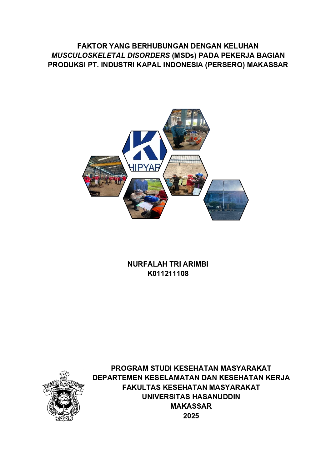 ARIMBI, NURFALAH TRI (2025) Faktor yang Berhubungan dengan Keluhan Musculoskeletal Disorders (MSDs) pada Pekerja Bagian Produksi PT. Industri Kapal Indonesia (Persero) Makassar = FACTORS RELATED TO MUSCULOSKELETAL DISORDERS (MSDs) COMPLAINTS AMONG PRODUCTION WORKERS AT PT. INDUSTRI KAPAL INDONESIA (PERSERO) MAKASSAR. Skripsi thesis, Universitas Hasanuddin.