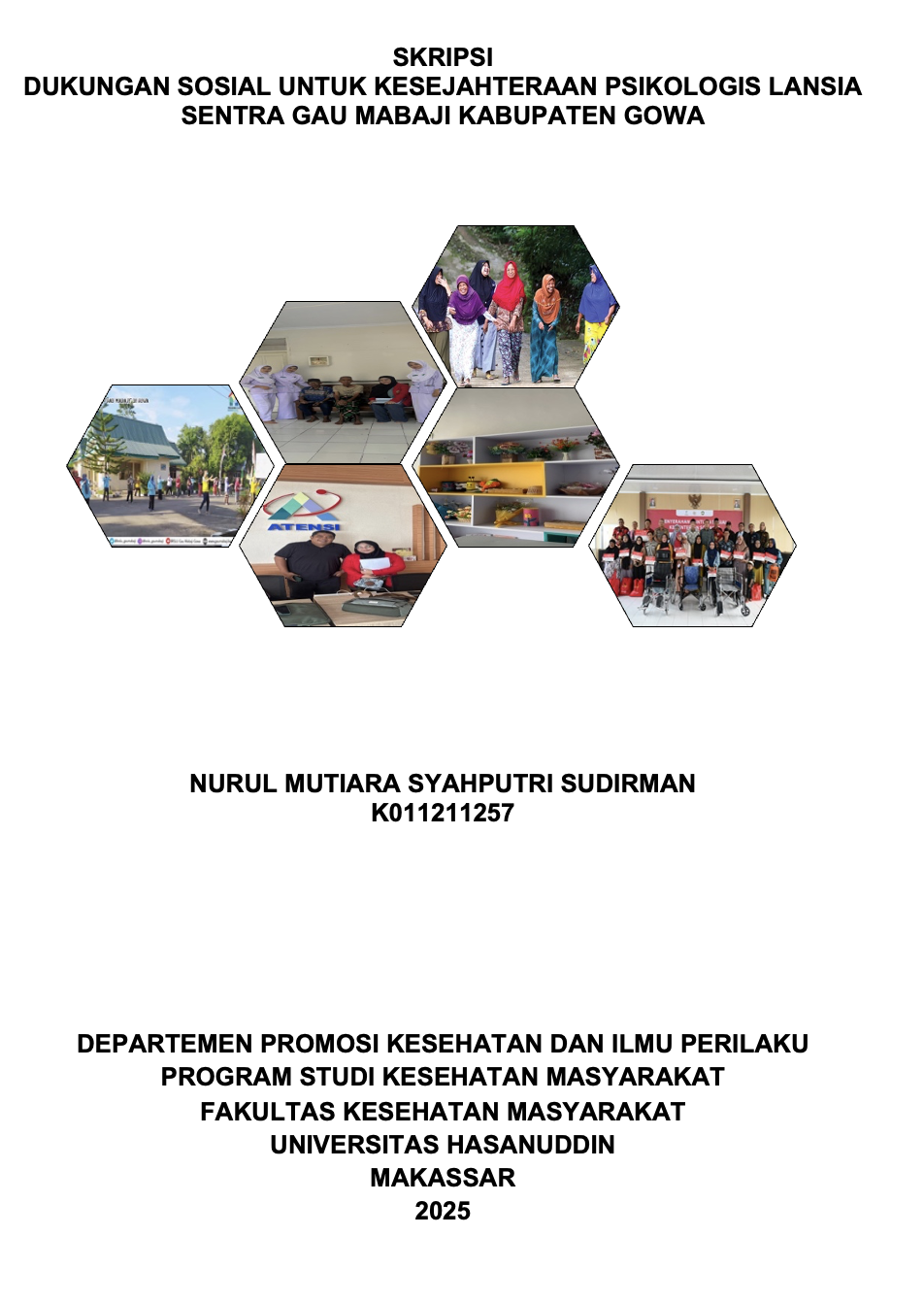SUDIRMAN, NURUL MUTIARA SYAHPUTRI (2025) Dukungan Sosial untuk Kesejahteraan Psikologis Lansia Sentra Gau Mabaji Kabupaten Gowa = Social Support for Psychological Wellbeing of the Elderly of Gau Mabaji Center, Gowa Regency. Skripsi thesis, Universitas Hasanuddin.