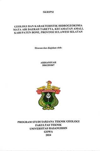 ARDIANSYAH, ARDIANSYAH (2024) Geologi dan Karakteristik Hidrogeokimia Mata Air Daerah Taretta, Kecamatan Amali, Kabupaten Bone, Provinsi Sulawesi Selatan = Geology and Hydrogeochemical Characteristics of Water Springs in the Taretta Area, Amali Sub-district, Bone Regency, South Sulawesi Province. Skripsi thesis, Universitas Hasanuddin.