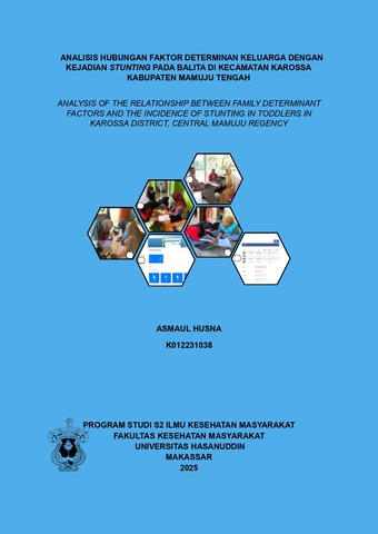 ABSTRAK : ASMAUL HUSNA. ANALISIS HUBUNGAN FAKTOR DETERMINAN KELUARGA DENGAN KEJADIAN STUNTING PADA BALITA DI KECAMATAN KAROSSA KABUPATEN MAMUJU TENGAH (dibimbing oleh Nur Nasry Noor dan Ida Leida Maria). Latar Belakang. Stunting adalah kondisi dimana balita memiliki panjang badan yang kurang jika dibandingkan dengan umur. Stunting memberikan dampak yang sangat merugikan, baik dalam jangka pendek maupun jangka panjang. Penurunan prevalensi stunting diprioritaskan untuk mencapai target di Indonesia sebesar 14%. Pemerintah, yaitu BKKBN menyusun rencana aksi nasional melalui pendekatan keluarga berisiko stunting. Oleh karena itu peneliti inigin melakukan analisis kejadian stunting berdasarkan determinan keluarga. Tujuan. Untuk menganalisis hubungan faktor determinan keluarga dengan kejadian stunting pada balita di Kecamatan Karossa. Metode. Jenis Penelitian yang digunakan adalah kuantitatif pendekatan observasional analitik dengan desain cross sectional study. Sampel yaitu 321 keluarga. Teknik pengambilan sampel yaitu Proportionate stratified random sampling dan purposive random sampling. Analisis data menggunakan program STATA dengan uji chisquare dan regresi logistik. Hasil. Terdapat 7 variabel yang diteliti terhadap kejadian stunting berdasarkan determinan keluarga, 4 diantaranya memiliki hubungan dengan kejadian stunting yaitu jamban tidak layak, PUS terlalu tua, PUS terlalu banyak dan PUS bukan peserta KB modern. Analisis regresi logistik menunjukkan keluarga dengan jamban tidak layak, bukan peserta KB modern dan mempunyai banyak anak berpeluang 93,1% memiliki anak stunting Kesimpulan. Penelitian ini menemukan keluarga dengan jamban tidak layak, bukan peserta KB modern dan mempunyai banyak anak berhubungan dengan kejadian stunting pada balita di Kecamatan Karossa. Pemerintah perlu memberikan penyuluhan rutin atau edukasi tentang pentingnya sanitasi layak dan penyuluhan tentang manfaat penggunaan KB modern untuk mengatur jarak kelahiran juga jumlah anak agar dapat membantu memastikan setiap anak mendapatkan perhatian, asupan gizi yang cukup, serta kesehatan yang optimal. ABSTRACT : ASMAUL HUSNA. ANALYSIS OF THE RELATIONSHIP BETWEEN FAMILY DETERMINANT FACTORS AND THE INCIDENCE OF STUNTING IN TODDLERS IN KAROSSA DISTRICT, CENTRAL MAMUJU REGENCY. (supervised by Nur Nasry Noor and Ida Leida Maria). Background. Stunting is a condition where toddlers have a body length that is less when compared to age. Stunting has a very detrimental impact, both in the short and long term. Reducing the prevalence of stunting is prioritized to achieve Indonesia's target of 14%. The government, namely BKKBN, has developed a national action plan through the stunting risk family approach. Therefore, this researcher wants to analyze the incidence of stunting based on family determinants. Aim. This study aims to analyze the relationship between family determinants and the incidence of stunting in toddlers in Karossa Sub-district. Methods. A cross-sectional study design using a quantitative analytical observational approach is the research methodology employed. There were 321 families in the sample. Purposive random sampling and proportionate stratified random sampling were the methods used for sampling. Using the STATA software, data is analyzed using logistic regression and the chisquare test. Results. There were 7 variables studied on the incidence of stunting based on family determinants, 4 of which had an association with the incidence of stunting, namely inadequate latrines, families with too old an age, families with too many children and not participating in modern family planning. Logistic regression analysis showed that families with inadequate latrines, not participating in modern family planning and having many children had a 93.1% chance of having stunted children Conclusion. Based on the study findings, inadequate sanitation facilities, lack of modern family planning use, and having numerous children were linked to stunting in children under five years old in Karossa Sub-district. The research suggests that government authorities should implement regular educational sessions or counseling that emphasizes proper sanitation practices and promotes the advantages of modern family planning methods. These interventions would help families better manage birth spacing and family size, ultimately ensuring that each child receives sufficient attention, proper nutrition, and better overall health.