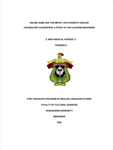 Online Games and The Impact on Students English Vocabulary Acquisition: A Study at Uin Alauddin Makassar (supervised by Nasmilah and Abidin) This study aims to (1) measure the overall vocabulary size of students at UIN Alauddin Makassar, (2) disclose the effect of online games on their vocabulary acquisition, and (3) reveal students' perceptions of using online games for vocabulary learning. Utilizing a descriptive quantitative research method, the sample comprised 73 English literature students in the 4th and 6th semesters who regularly play the online game Genshin Impact and have completed the Vocabulary class. The research instruments included a questionnaire and a vocabulary test. The results indicated that students possess moderate to high vocabulary proficiency, with an average score of 75.98, suggesting that interactive and engaging methods like online games can effectively enhance vocabulary learning. The findings revealed that online games positively influence vocabulary acquisition and improve related skills such as listening, reading, speaking, writing, word selection, sentence arrangement, and pronunciation. Students reported that their enjoyment and engagement with Genshin Impact significantly contributed to their vocabulary acquisition. These conclusions underscore the potential benefits of integrating online games into language learning programs to enhance students' overall language proficiency and related skills.