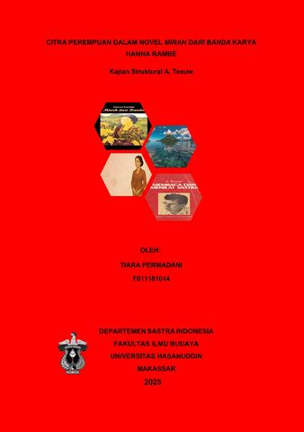 ABSTRAK TIARA PERMADANI. Citra Perempuan dalam Novel Mirah dari Banda Karya Hanna Rambe (dibimbing oleh Inriati Lewa dan St. Nursa’adah). Latar Belakang. Penggambaran tokoh perempuan pribumi dalam penelitian ini menunjukkan perbedaan dengan citra perempuan pada masa penjajahan yang umumnya ditampilkan dalam karya sastra. Tujuan. Penelitian ini bertujuan untuk mendeskripsikan citra perempuan pribumi serta menganalisis peran unsur latar dalam membentuk citra tersebut. Metode. Metode yang digunakan adalah deskriptif kualitatif dengan pendekatan struktural A. Teeuw untuk mengidentifikasi unsur intrinsik, khususnya tokoh dan latar. Hasil. Hasil penelitian menunjukkan bahwa tokoh perempuan dalam novel ini memiliki citra fisik yang menarik dan kerap menjadi objek perhatian, baik laki-laki maupun perempuan, serta citra psikis yang mandiri, tegar, dan tidak mudah terpengaruh oleh dominasi kolonial maupun patriarki. Selain itu, latar Kepulauan Banda pada masa penjajahan berperan penting dalam membentuk karakter dan perjuangan tokoh utama. Kata Kunci: citra perempuan, novel, strukturalisme. ABSTRACT TIARA PERMADANI. The Image of Women in the Novel Mirah dari Banda by Hanna Rambe (supervised by Inriati Lewa and St. Nursa’adah). Background. The portrayal of indigenous female characters in this study reveals a contrast with the image of women commonly depicted in literary works during the colonial period. Aim. This research aims to describe the image of indigenous women and to analyze the role of setting elements in shaping that image. Method. This study employs a descriptive qualitative method using A. Teeuw’s structural approach to identify intrinsic elements, particularly character and setting. Results. The findings show that the female character in this novel possesses an attractive physical appearance, often becoming the object of attention from both male and female characters, as well as a strong psychological image—independent, resilient, and not easily influenced by colonial or patriarchal domination. Additionally, the setting of the Banda Islands during the colonial era plays a significant role in shaping the character and struggles of the main protagonist. Keywords: image of women, novel, structuralism.