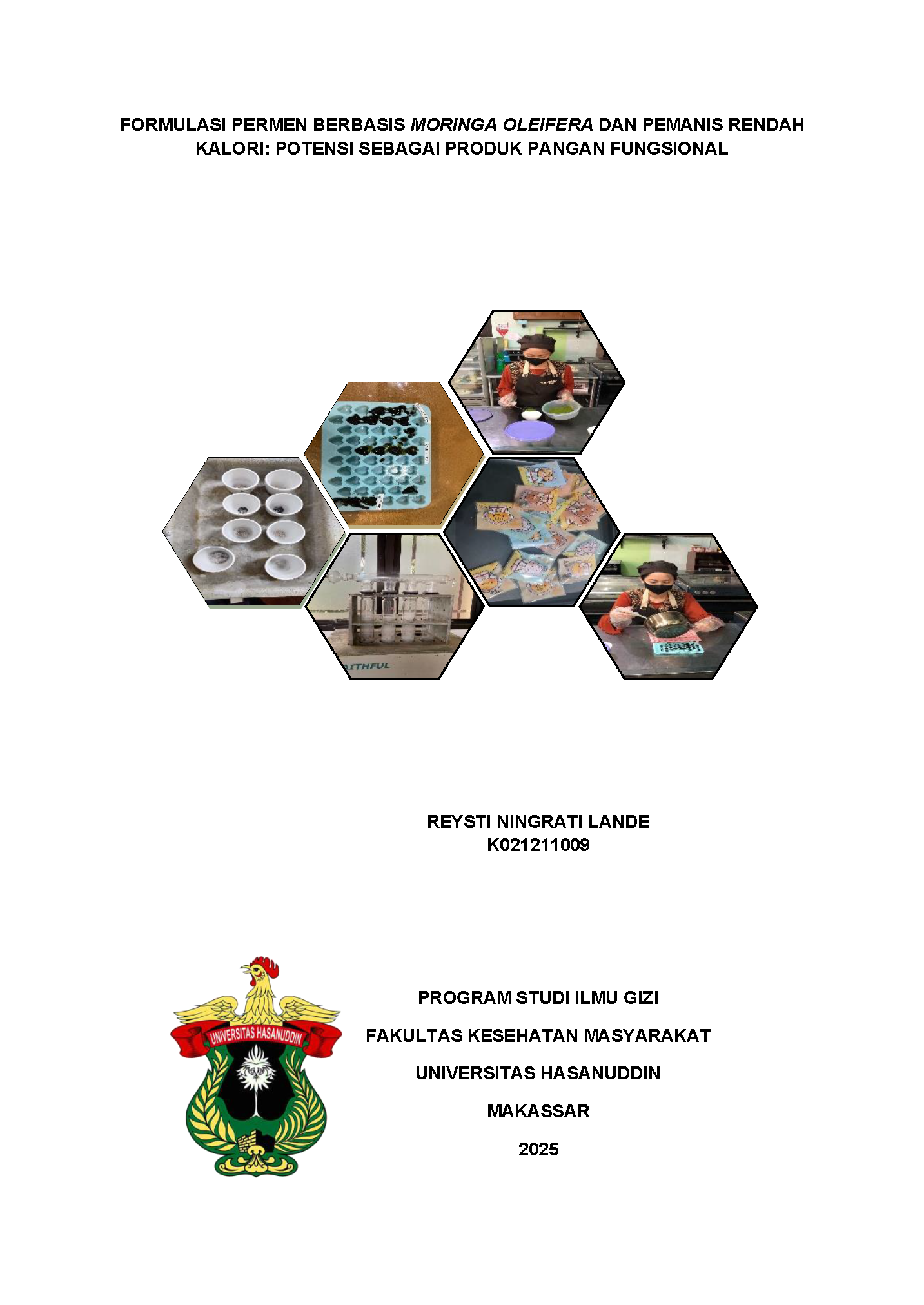 LANDE, REYSTI NINGRATI (2025) FORMULASI PERMEN BERBASIS MORINGA OLEIFERA DAN PEMANIS RENDAH KALORI: POTENSI SEBAGAI PRODUK PANGAN FUNGSIONAL = MORINGA OLEIFERA-BASED CANDY FORMULATION AND LOW-CALORIE SWEETENER: POTENTIAL AS A FUNCTIONAL FOOD PRODUCT. Skripsi thesis, Universitas Hasanuddin.