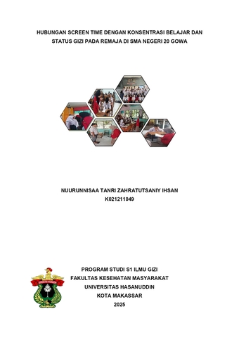 IHSAN, NUURUNNISAA TANRI ZAHRATUTSANIY (2025) Hubungan Screen Time dengan Konsentrasi Belajar dan Status Gizi pada Remaja di SMA Negeri 20 Gowa = The Association of Screen Time with Learning Concentration and Nutritional Status among Adolescents at Senior High School 20 Gowa. Skripsi thesis, Universitas Hasanuddin.