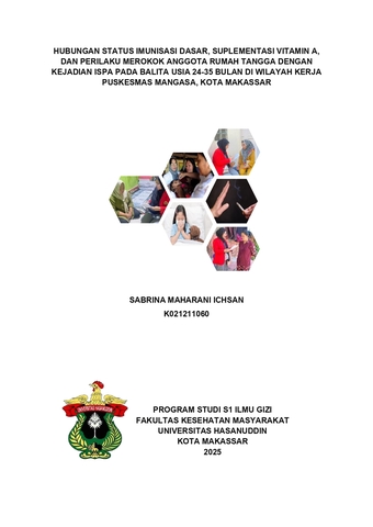 ICHSAN, SABRINA MAHARANI (2025) Hubungan Status Imunisasi Dasar, Suplementasi Vitamin A, dan Perilaku Merokok Anggota Rumah Tangga dengan Kejadian ISPA Pada Balita Usia 24-35 Bulan di Wilayah Kerja Puskesmas Mangasa, Kota Makassar = The Relationship Between Basic Immunization Status, Vitamin A Supplementation, and Household Smoking Behavior with the Incidence of Acute Respiratory Infections (ARI) in Toddlers Aged 24–35 Months in the Working Area of Mangasa Public Health Center, Makassar City. Skripsi thesis, Universitas Hasanuddin.