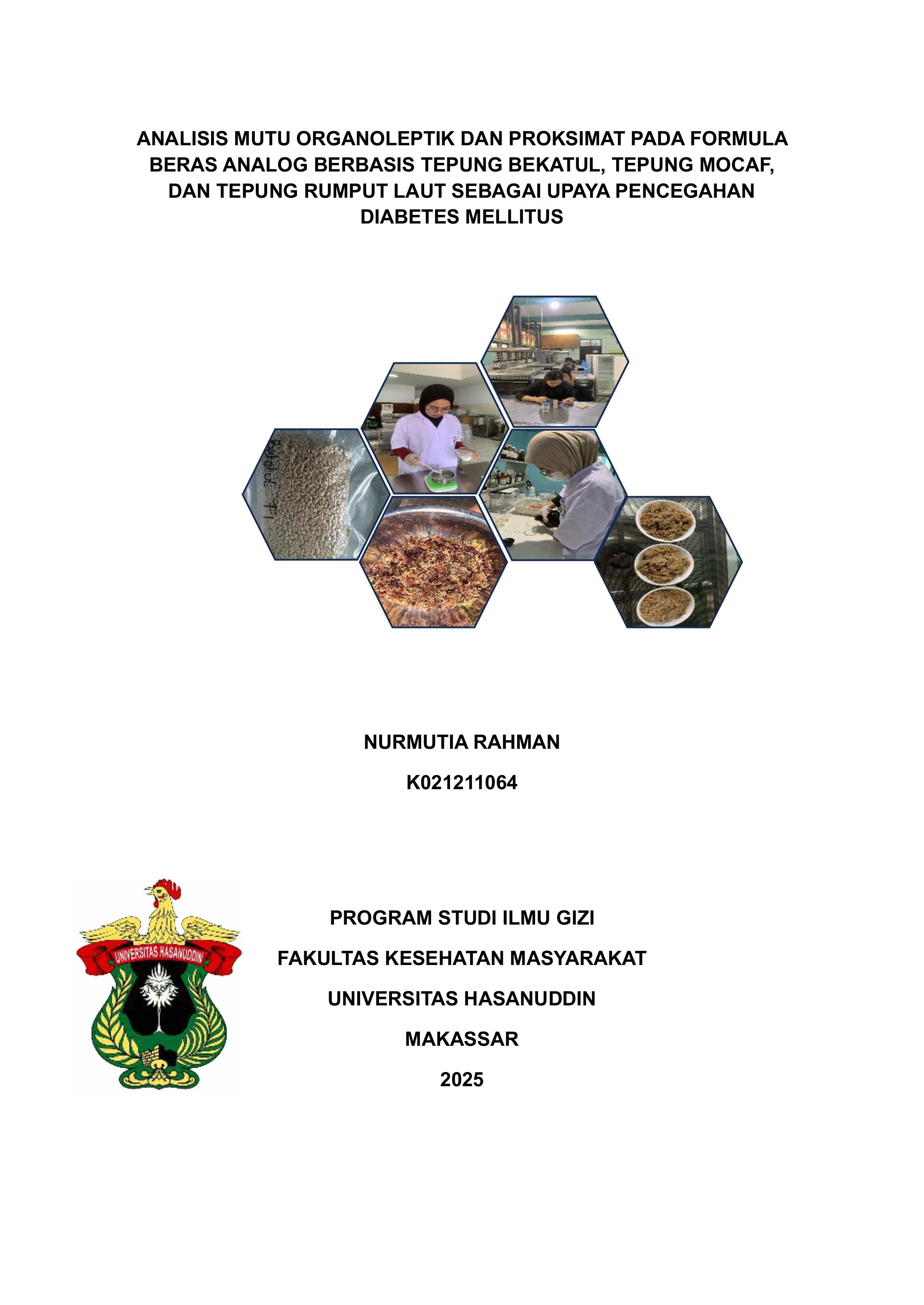 RAHMAN, NURMUTIA (2025) ANALISIS MUTU ORGANOLEPTIK DAN PROKSIMAT PADA FORMULA BERAS ANALOG BERBASIS TEPUNG BEKATUL, TEPUNG MOCAF, DAN TEPUNG RUMPUT LAUT SEBAGAI UPAYA PENCEGAHAN DIABETES MELLITUS = ANALYSIS OF ORGANOLEPTIC AND PROXIMATE QUALITY IN ANALOG RICE FORMULAS BASED ON BRAN FLOUR, MOCAF FLOUR, AND SEAWEED FLOUR AS A MEASURE TO PREVENT DIABETES MELLITUS. Skripsi thesis, Universitas Hasanuddin.
