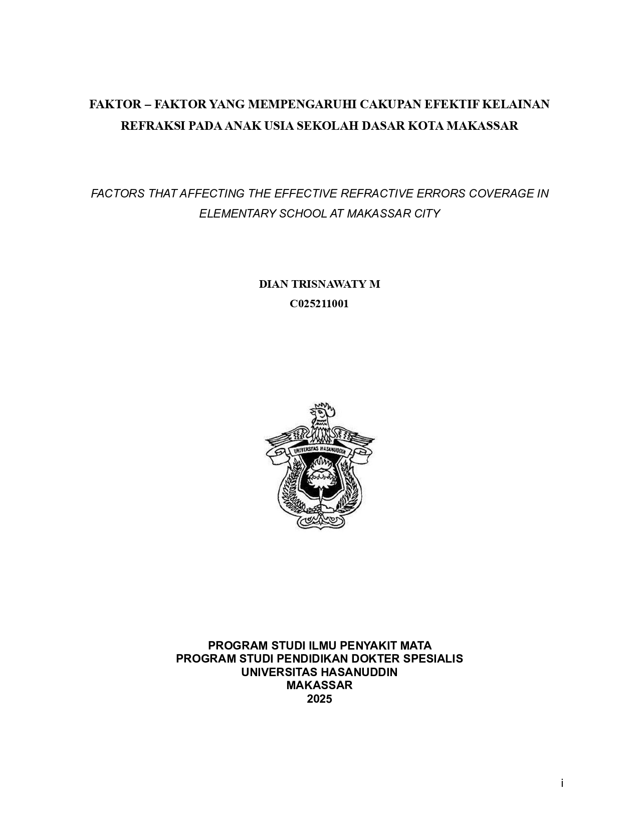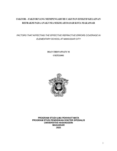 TRISNAWATY M., DIAN (2025) FAKTOR – FAKTOR YANG MEMPENGARUHI CAKUPAN EFEKTIF KELAINAN REFRAKSI PADA ANAK USIA SEKOLAH DASAR KOTA MAKASSAR = FACTORS THAT AFFECTING THE EFFECTIVE REFRACTIVE ERRORS COVERAGE IN ELEMENTARY SCHOOL AT MAKASSAR CITY. Skripsi thesis, Universitas Hasanuddin.
