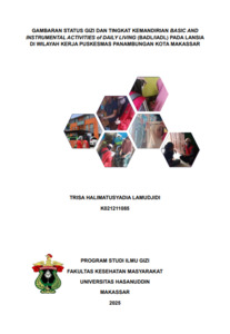 LAMUDJIDI, TRISA HALIMATUSYADIA (2025) GAMBARAN STATUS GIZI DAN TINGKAT KEMANDIRIAN BASIC AND INSTRUMENTAL ACTIVITIES of DAILY LIVING (BADL/IADL) PADA LANSIA DI WILAYAH KERJA PUSKESMAS PANAMBUNGAN KOTA MAKASSAR = DESCRIPTION OF NUTRITIONAL STATUS AND LEVEL OF INDEPENDENCE OF BASIC AND INSTRUMENTAL ACTIVITIES OF DAILY LIVING (BADL/IADL) IN THE ELDERLY IN THE WORK AREA OF PANAMBUNGAN HEALTH CENTER, MAKASSAR CITY. Skripsi thesis, Universitas Hasanuddin.
