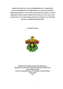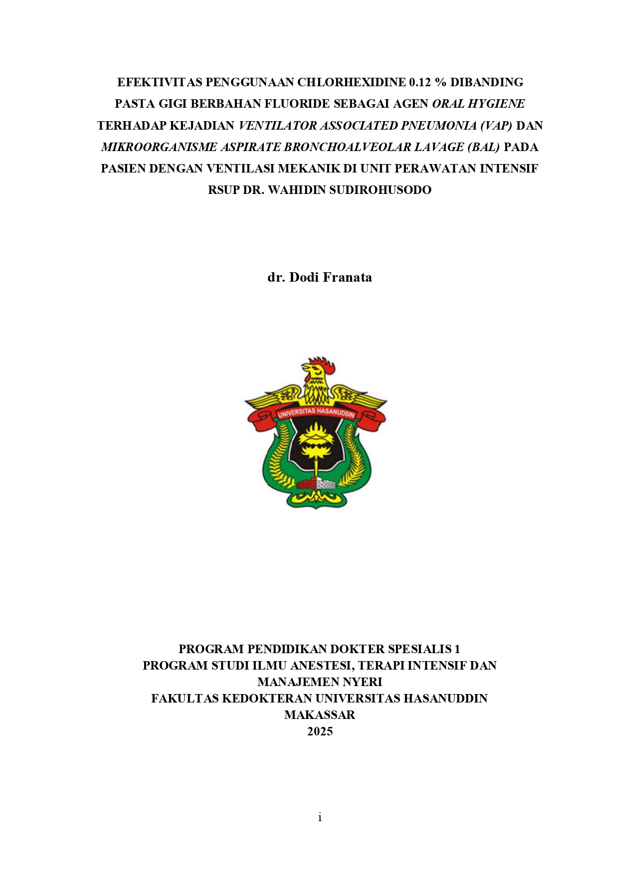 FRANATA, DODI (2025) EFEKTIVITAS PENGGUNAAN CHLORHEXIDINE 0.12 % DIBANDING PASTA GIGI BERBAHAN FLUORIDE SEBAGAI AGEN ORAL HYGIENE TERHADAP KEJADIAN VENTILATOR ASSOCIATED PNEUMONIA (VAP) DAN MIKROORGANISME ASPIRATE BRONCHOALVEOLAR LAVAGE (BAL) PADA PASIEN DENGAN VENTILASI MEKANIK DI UNIT PERAWATAN INTENSIF RSUP DR. WAHIDIN SUDIROHUSODO. Skripsi thesis, Universitas Hasanuddin.