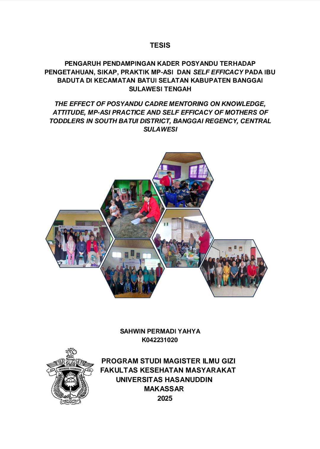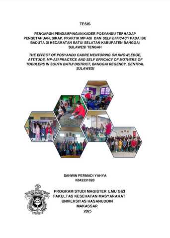 Sahwin Permadi Yahya. Pengaruh Pendampingan Kader Posyandu Terhadap Pengetahuan, Sikap, Praktik Mp-Asi Dan Self Efficacy Pada Ibu Baduta Di Kecamatan Batui Selatan Kabupaten Banggai Sulawesi Tengah (dibimbing oleh Veni Hadju dan Aminuddin Syam) LATAR BELAKANG: Posyandu mendukung kesehatan ibu dan anak, namun masih terdapat tantangan dalam meningkatkan pengetahuan dan keterampilan ibu dalam mengelola anak kurang gizi. Penelitian ini bertujuan untuk menilai pengaruh kader posyandu dalam pendampingan ibu anak kurang gizi terhadap pengetahuan, sikap, praktik, dan efikasi diri dalam pemberian makanan pendamping.METODE: Penelitian ini menggunakan desain quasi-eksperimental dengan pre-post-test control group. Ibu-ibu yang memiliki anak usia 6-24 bulan dibagi menjadi kelompok intervensi dan kontrol (30 sampel untuk setiap kelompok). Data dikumpulkan menggunakan kuesioner terstruktur. Penelitian ini dilakukan selama 2 bulan di 6 desa, dengan 3 desa intervensi dan 3 desa kontrol di kecamatan batui selatan. Data dianalisis menggunakan statistik deskriptif, uji-t independen, dan uji-t berpasangan. Nilai-p < 0,05 dianggap signifikan secara statistik.HASIL : Sebagian besar ibu adalah ibu rumah tangga (67%) dan telah menyelesaikan pendidikan SMP atau SMA. Tidak terdapat perbedaan antar kelompok pada awal penelitian pada semua variabel yang diukur. Terdapat peningkatan pengetahuan yang signifikan sebelum dan sesudah intervensi, yaitu 62,0±7,14 menjadi 87,0±5,96 (p<0,001). Variabel sikap juga menunjukkan perubahan yang signifikan, yaitu 63,7±10,3 menjadi 91,6±7,46 (p<0,001). Pada kelompok intervensi, keragaman konsumsi pangan antara sebelum dan sesudah intervensi menunjukkan perbedaan yang signifikan, yaitu 3,90±1,15 menjadi 5,33±1,24 (p<0,040). Tingkat efikasi diri meningkat secara signifikan antara intervensi sebelum dan sesudah pada kelompok intervensi 54,6±14,0 menjadi 88,0±4,06 (p<0,001). KESIMPULAN : Pelaksanaan pendampingan jangka pendek oleh kader posyandu menunjukkan adanya peningkatan yang signifikan dalam hal pengetahuan, sikap, praktik, dan efikasi diri dikalangan ibu-ibu yang memiliki anak kurang gizi.