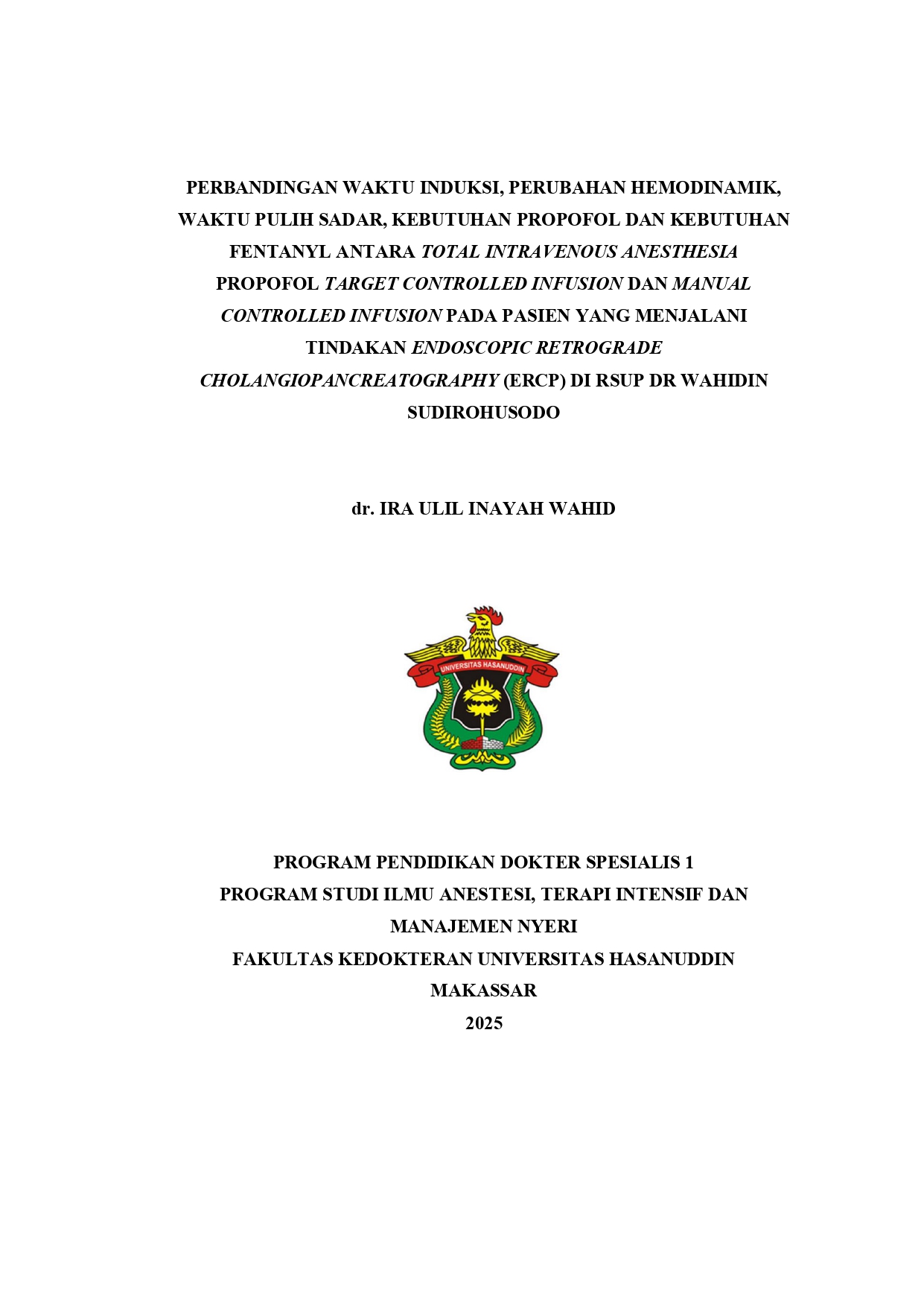WAHID, IRA ULIL INAYAH (2025) PERBANDINGAN WAKTU INDUKSI, PERUBAHAN HEMODINAMIK, WAKTU PULIH SADAR, KEBUTUHAN PROPOFOL DAN KEBUTUHAN FENTANYL ANTARA TOTAL INTRAVENOUS ANESTHESIA PROPOFOL TARGET CONTROLLED INFUSION DAN MANUAL CONTROLLED INFUSION PADA PASIEN YANG MENJALANI TINDAKAN ENDOSCOPIC RETROGRADE CHOLANGIOPANCREATOGRAPHY (ERCP) DI RSUP DR WAHIDIN SUDIROHUSODO = Comparison of induction time, hemodynamic changes, recovery time, propofol requirement, and fentanyl requirement between total intravenous anesthesia with propofol using target-controlled infusion and manual infusion in patients undergoing Endoscopic Retrograde Cholangiopancreatography (ERCP) at RSUP Dr. Wahidin Sudirohusodo". Berikut adalah rincian terjemahan per bagian:. Skripsi thesis, Universitas Hasanuddin.