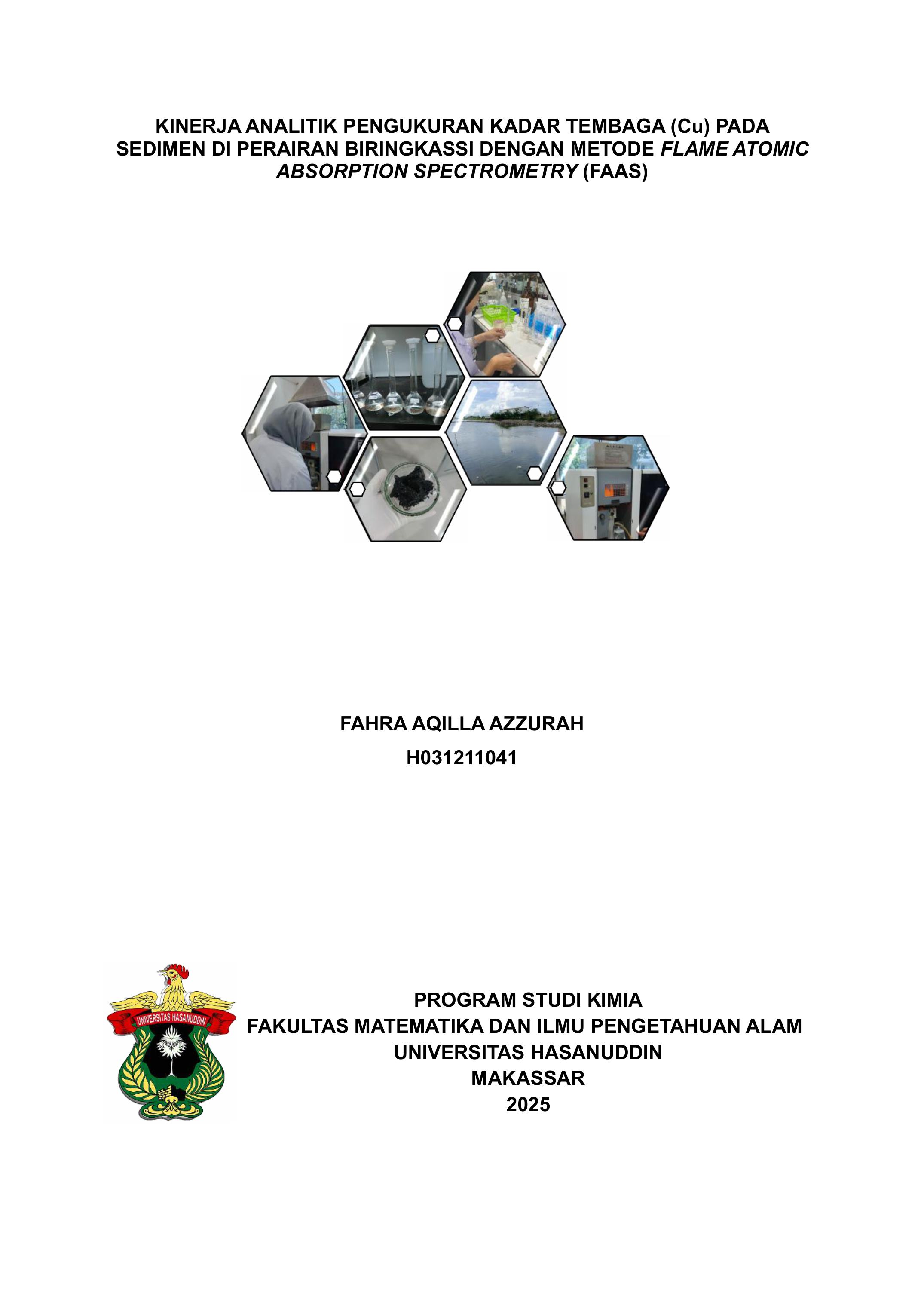 AZZURAH, FAHRA AQILLA (2025) Kinerja Analitik Pengukuran Kadar Tembaga (Cu) pada Sedimen di Perairan Biringkassi dengan Metode Flame Atomic Absorption Spectrometry (FAAS) = Analytical Performance of Copper (Cu) Level Measurement on Sediments in Biringkassi Waters with Flame Atomic Absorption Spectrometry (FAAS). Skripsi thesis, Universitas Hasanuddin.