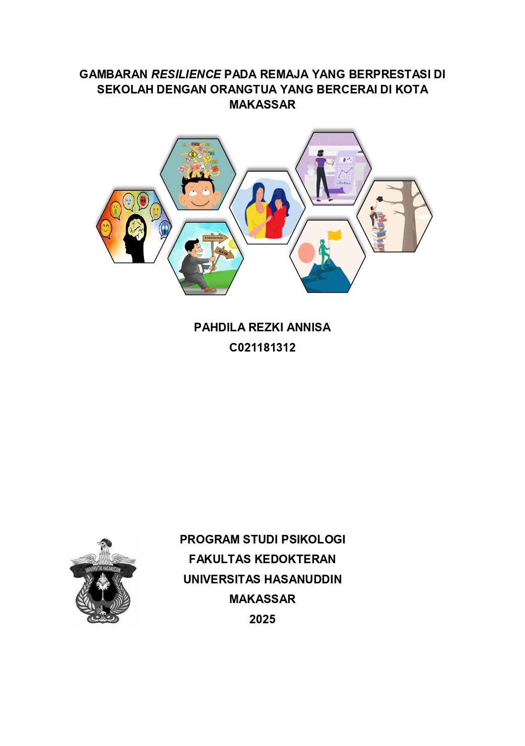 PAHDILA REZKI ANNISA, C021181312, Gambaran Resillience Pada Remaja yang Berprestasi di Sekolah Dengan Orang Tua yang Bercerai di Kota Makassar, Skripsi, Fakultas Kedokteran, Program Studi Psikologi, Universitas Hasanuddin, Makassar, 2025, (dibimbing oleh Andi Tenri Pada Rustham). Latar Belakang. Perceraian orang tua dapat menjadi faktor stress yang signifikan bagi remaja, terutama dalam konteks akademik. Namun, beberapa remaja tetap mampu menunjukkan prestasi akademik yang tinggi meskipun menghadapi kondisi keluarga yang tidak utuh. Penelitian ini bertujuan untuk menggambarkan resillience pada remaja berprestasi di sekolah yang berasal dari keluarga bercerai di Kota Makassar. Resillience diidentifikasi sebagai kemampuan individu untuk beradaptasi, bertahan dan berkembang secara positif meskipun mengalami tekanan psikologis dan sosial. Studi ini menggunakan pendekatan kualitatif dengan metode wawancara mendalam terhadap beberapa remaja berprestasi yang orangtuanya bercerai. Tujuan. dari penelitian ini yaitu untuk mengetahui secara mendalam gambaran resillience remaja yang berprestasi di sekolah dengan orangtua bercerai. Metode. penelitian ini merupakan jenis penelitian kualitatif. Hasil. penelitian menunjukkan bahwa terdapat aspek-aspek yang berkontribusi terhadap resillience ialah emotion regulation, impuls control, optimist, analysis, emphaty, self-efficacy, dan reaching out. Selain itu, keberadaan figur pendukung, seperti informasi pribadi yang berasal dari keluarga besar juga berperan dalam membantu remaja mengelola emosi dan menjaga fokus terhadap tujuan pendidikan mereka. Kesimpulannya, resillience pada remaja berprestasi yang orang tua bercerai tidak hanya dipengaruhi oleh faktor internal tetapi juga oleh lingkungan sosial.