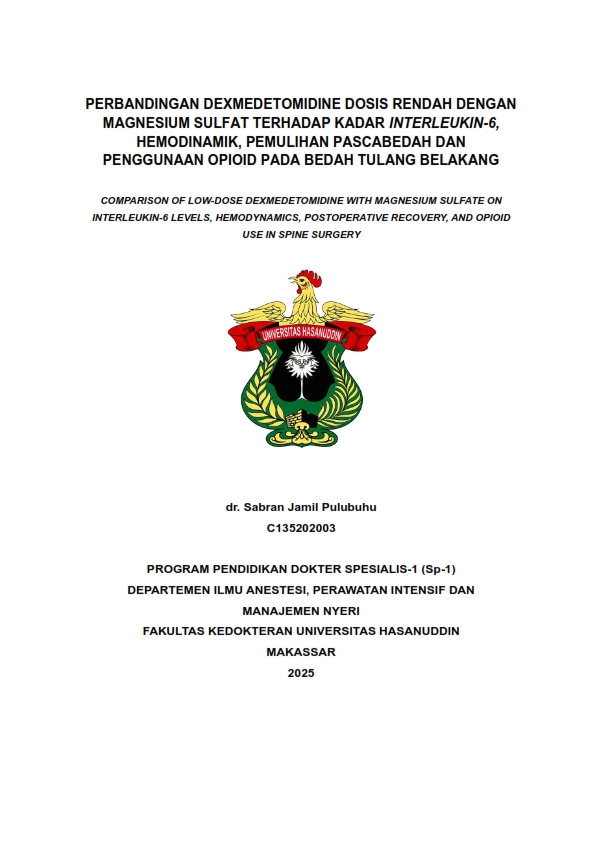 PULUBUHU, SABRAN JAMIL (2025) PERBANDINGAN DEXMEDETOMIDINE DOSIS RENDAH DENGAN MAGNESIUM SULFAT TERHADAP KADAR INTERLEUKIN -6, HEMODINAMIK, PEMULIHAN PASCABEDAH DAN PENGGUNAAN OPIOID PADA BEDAH TULANG BELAKANG = COMPARISON OF LOW-DOSE DEXMEDETOMIDINE WITH MAGNESIUM SULFATE ON INTERLEUKIN-6 LEVELS, HEMODYNAMICS, POSTOPERATIVE RECOVERY, AND OPIOID USE IN SPINE SURGERY. Skripsi thesis, Universitas Hasanuddin.