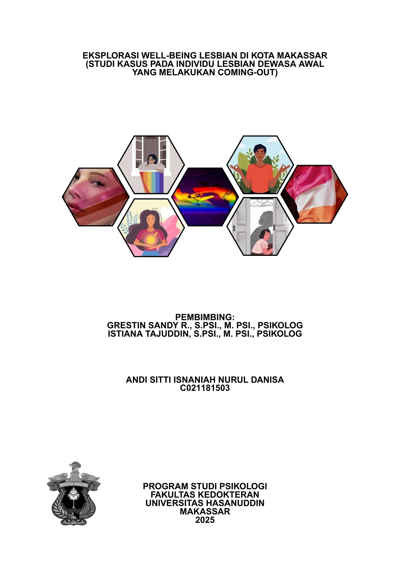 ANDI SITTI ISNANIAH NURUL DANISA. Eksplorasi Well-being Lesbian di Kota Makassar (Studi Kasus pada Individu Lesbian Dewasa Awal yang Melakukan Coming-out). (Dibimbing oleh Grestin Sandy R., S.Psi., M.Psi., Psikolog dan Istiana Tajuddin, S.Psi., M.Psi., Psikolog). Proses coming-out merupakan perjalanan penting dalam penemuan dan penerimaan diri bagi individu lesbian, yang sering kali disertai dinamika emosional, sosial, dan spiritual yang kompleks. Penelitian ini mengeksplorasi kesejahteraan (well-being) individu lesbian dewasa awal di Kota Makassar yang telah melalui proses coming-out, dengan menyoroti hambatan-hambatan yang memengaruhi tercapainya kesejahteraan secara holistik. Penelitian ini menggunakan pendekatan kualitatif dengan metode studi kasus terhadap seorang partisipan berusia 22 tahun yang mengidentifikasi diri sebagai lesbian dan telah melakukan coming-out. Data dikumpulkan melalui wawancara mendalam semi-terstruktur dan dianalisis secara tematik dengan bantuan perangkat lunak MAXQDA. Hasil penelitian menunjukkan bahwa subjek mengalami kesulitan dalam mencapai kesejahteraan secara holistik akibat ketidakseimbangan dalam aspek fisik, psikologis, sosial, dan spiritual. Konflik internal yang berkelanjutan muncul karena proses pembentukan identitas lesbian dan proses coming-out yang tidak tercapai secara optimal. Tekanan sosial, stigma budaya, dan kurangnya dukungan lingkungan memperburuk kondisi kesejahteraan subjek. Interaksi antara faktor internal dan eksternal menjadi penentu utama tingkat kesejahteraan individu lesbian. Kata Kunci: Coming-out, Lesbian, Pembentukan identitas, Dewasa awal, Studi kasus, Well-being.