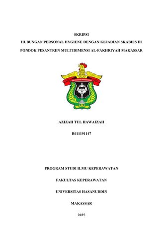 Azizah Tul Hawaizah R011191147 HUBUNGAN PERSONAL HYGIENE DENGAN KEJADIAN SKABIES DI PONDOK PESANTREN MULTIDIMENSI AL-FAKHRIYAH MAKASSAR, dibimbing oleh Abdul Majid dan Nuurhidayat Jafar. Latar Belakang : Skabies merupakan penyakit kulit menular yang disebabkan oleh tungau Sarcoptes Scabiei Var. Hominis yang penularannya melalui kontak kulit yang dekat dengan individu yang terinfeksi. Faktor yang menjadi penunjang berkembangnya penyakit skabies antara lain hygiene yang buruk seperti tidak suka mencuci tangan dan kurangnya menjaga kebersihan diri. Tujuan : Mengetahui adanya hubungan personal hygiene santri dengan kejadian skabies di Pondok Pesantren Multidimensi Al-Fakhriyah Makassar. Metode : Penelitian ini menggunakan rancangan penelitian kuantitatif dengan menggunakan observasional analitik dengan pendekatan case control. Menggunakan kuesioner demografi, Kejadian Skabies, dan Personal Hygiene. Dengan teknik total sampling. Responden pada penelitian ini berjumlah 32 orang. Hasil : berdasarkan penelitian didapatkan kejadian skabies yaitu terdapat 16 responden (50%). Dari hasil uji chi-square terkait hubungan antara ph dan didapatkan nilai p-value = 0.013 dimana p-value <0,05. Kesimpulan : hasil penelitian didapatkan bahwa terdapat hubungan yang signifikan antara personal hygiene dengan kejadian skabies pada kelompok kontrol dan kelompok kasus. Terkait dengan personal hygiene buruk mayoritas kurang dalam kebersihan handuk. Kata Kunci : Personal Hygiene, Penyakit Skabies Sumber Literatur : 42 Kepustakaan (2017-2024)