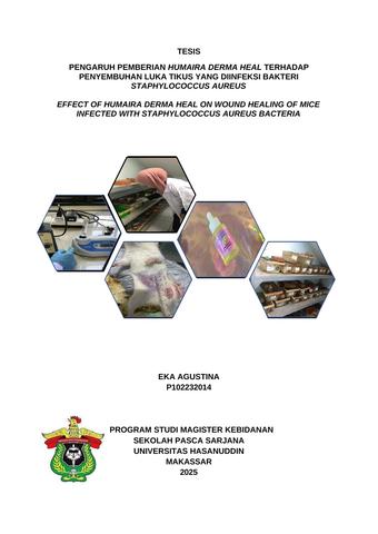 EKA AGUSTINA. Pengaruh Pemberian Humaira Derma Heal Terhadap Penyembuhan Luka Tikus yang Diinfeksi Bakteri Staphylococcus aureus. (Dibimbing oleh Dr. Andi Nilawati Usman dan Dr. Risfah Yulianty) Latar Belakang: Penyembuhan luka pasca infeksi bakteri seringkali memerlukan waktu yang lama dan dapat mengalami komplikasi, terutama pada luka yang disebabkan oleh Staphylococcus aureus. Luka sayat yang terjadi pada prosedur medis seperti operasi sectio caesarea (SC) atau kecelakaan seringkali berisiko tinggi untuk terinfeksi dan memperlambat proses penyembuhan. Penggunaan antibiotik secara berlebihan dapat menyebabkan resistensi bakteri, sehingga diperlukan terapi alternatif yang lebih aman dan efektif. Humaira Derma Heal, kombinasi liniment minyak ayam broiler dan Virgin Coconut Oil (VCO), memiliki potensi sebagai terapi komplementer dalam mempercepat penyembuhan luka dan mencegah infeksi. Tujuan: Penelitian ini bertujuan untuk menganalisis pengaruh pemberian Humaira Derma Heal terhadap penyembuhan luka pada tikus yang diinfeksi bakteri Staphylococcus aureus. Metode: Penelitian ini menggunakan desain eksperimen murni dengan 28 tikus betina sehat yang dibagi menjadi tiga kelompok perlakuan. Kelompok pertama diberi antibiotik dan antinyeri, sementara kelompok kedua dan ketiga diberi perlakuan dengan berbagai konsentrasi Humaira Derma Heal (60:40% dan 40:60%) selain antibiotik dan antinyeri. Penyembuhan luka dinilai menggunakan skala REEDA (kemerahan, pembengkakan, bercak perdarahan, pengeluaran, dan penyatuan luka). Data dianalisis menggunakan uji Kruskal-Wallis dan Friedman dengan bantuan SPSS. Hasil : Hasil analisis menunjukkan bahwa kedua formulasi Humaira Derma Heal (60:40% dan 40:60%) secara signifikan lebih efektif dalam mempercepat penyembuhan luka dibandingkan kelompok yang hanya diberi antibiotik dan antinyeri. Formulasi dengan konsentrasi 40:60% menunjukkan hasil terbaik, dengan penurunan kemerahan, pembengkakan, bercak perdarahan, pengeluaran, dan penyatuan luka yang lebih cepat. Hasil uji statistik menunjukkan perbedaan signifikan antar kelompok dengan nilai p < 0,05. Kesimpulan: Humaira Derma Heal dapat menjadi alternatif yang efektif dan lebih aman dibandingkan terapi konvensional dengan antibiotik dalam penyembuhan luka yang diinfeksi Staphylococcus aureus. Formulasi dengan konsentrasi 40:60% memberikan hasil terbaik dalam mempercepat proses penyembuhan luka.