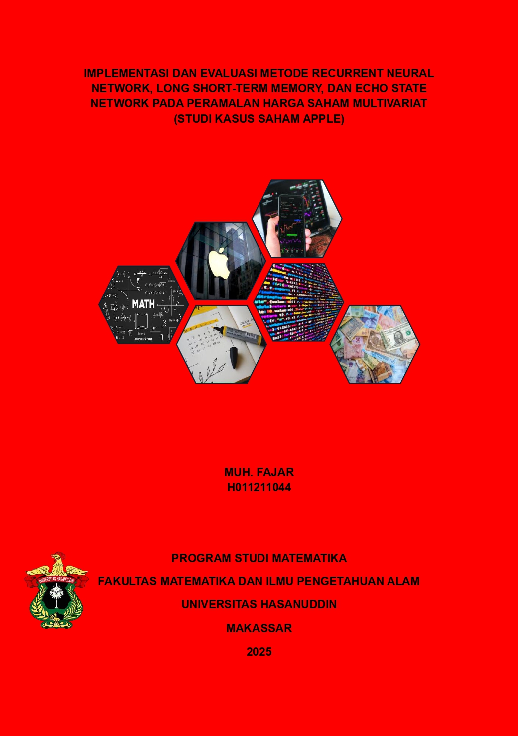 MUH. FAJAR. Implementasi dan Evaluasi Metode Recurrent Neural Network, Long Short-Term Memory, dan Echo State Network Pada Peramalan Harga Saham Multivariat (Studi Kasus Saham Apple) (dibimbing oleh Khaeruddin) Latar belakang. Saham merupakan instrumen investasi yang sangat diminati karena potensi keuntungannya cukup menarik. Saham Apple yang terdaftar dalam Nasdaq-100(NDX) dengan simbol ticker AAPL, adalah pilihan populer dikalangan investor karena kinerja keuangannya yang impresif. Namun, pergerakan harga saham Apple yang fluktuatif dapat menimbulkan keuntungan atau kerugian bagi investor. Tujuan. Penelitian ini bertujuan untuk meramalkan harga saham Apple dengan mengimplementasikan model RNN (Recurrent Neural Network), LSTM (Long Short-Term Memory), dan ESN (Echo State Network) kemudian mengevaluasi kinerja ketiga model tersebut. Metode. Data historis harga saham Apple selama 6 tahun dikumpulkan dan diproses menjadi data latih dan data uji. Data latih digunakan untuk melatih ketiga model tanpa dan dengan menerapkan GSCV (Grid Search Cross Validation). Data uji digunakan untuk melakukan peramalan harga saham dan mengevaluasi kinerja model. Hasil. Penerapan metode GSCV dapat meningkatkan kinerja ketiga model dan mengurangi risiko overfitting, namun mengakibatkan waktu komputasi menjadi lama. Terjadi peningkatan nilai R2 sebesar 0.96% pada RNN, 0.58% pada LSTM, dan 0.08% pada ESN. Kesimpulan. Pada penelitian ini, model LSTM mengungguli kinerja model RNN dari segi akurasi, namun kalah dari segi waktu komputasi. Sedangkan model ESN mengungguli kinerja model RNN dan LSTM karena menghasilkan akurasi terbaik dengan waktu komputasi paling singkat.