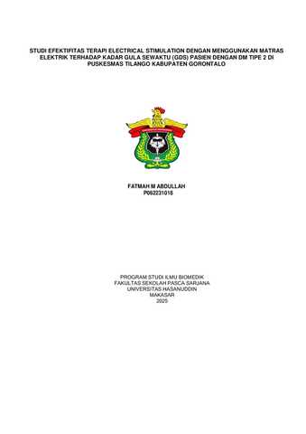 ABSTRAK Fatmah M. Abdullah. Studi Efektifitas Terapi Electrical Stimulation Dengan Menggunakan Matras Elektrik Terhadap Kadar Gula Sewaktu (GDS) Pasien Dengan Dm Tipe 2 Di Puskesmas Tilango Kabupaten Gorontalo (dibimbing oleh Aryadi Arsyad dan Ika Yustisia) Latar Belakang: Diabetes Mellitus (Dm) merupakan penyakit kronis yang terjadi saat pankreas tidak cukup dalam menghasilkan insulin atau saat tubuh tidak dapat secara efektif menggunakan insulin yang telah dihasilkan ditandai dengan hiperglikemia persisten. Penelitian ini bertujuan untuk mengetahui nilai rata-rata gula darah sewaktu (GDS) sebelum dan sesudah intervensi terapi elektrical stimulation dengan menggunakan matras elektrik. Metode: Sebanyak 25 pasien DM secara Purposive sampling dengan quasi eksperimental design menggunakan nonequivalent control group design, dibagi menjadi dua kelompok (n=13 kelompok eksperimen & n=12 kelompok kontrol): kelompok eksperimen menerima intervensi terapi matras elektrik selama 60 menit sebanyak 3 sesi selama 4 minggu bersamaan dengan mengkonsumsi obat oral yang mengandung sulfonilurea sesuai dosis, sedangkan kelompok kontrol mengkonsumsi obat oral dengan kandungan sulfonilurea sesuai dosis tanpa menjalani terapi matras elektrik. Pengukuran hasil mencakup penilaian kadar GDS 30 menit sebelum terapi dan 30 menit setelah terapi dengan menggunakan alat autocheck. Hasil: Setelah intervensi, analisis data menunjukkan penurunan rata-rata GDS yang signifikan pada kelompok eksperimen, yaitu dari 250,4 mg/dL menjadi 190,8 mg/dL (p < 0,05), dibandingkan dengan kelompok kontrol yang mengalami perubahan minimal, dari 248,2 mg/dL menjadi 240,1 mg/dL (p > 0,05). Kesimpulan: Pada Kelompok Eksperimen secara konsisten menunjukkan penurunan kadar GDS pada pasien DM tipe 2, Penurunan ini signifikan secara statistik berdasarkan analisis pre-test dan post-test, sedangkan pada Kelompok Kontrol hanya mengonsumsi obat antidiabetes oral tanpa terapi matras elektrik menunjukkan penurunan kadar GDS yang lebih kecil, mengindikasikan bahwa intervensi dengan matras elektrik memberikan manfaat tambahan yang signifikan.