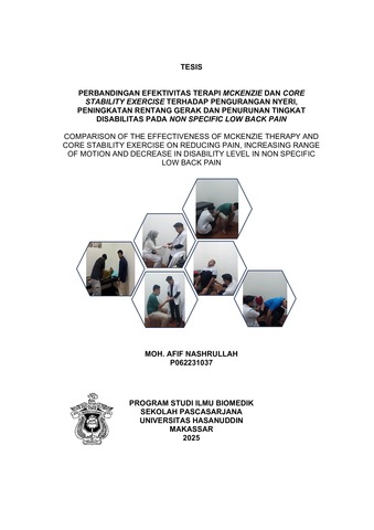 NASHRULLAH, MOH. AFIF (2025) PERBANDINGAN EFEKTIVITAS TERAPI MCKENZIE DAN CORE STABILITY EXERCISE TERHADAP PENGURANGAN NYERI, PENINGKATAN RENTANG GERAK DAN PENURUNAN TINGKAT DISABILITAS PADA NON SPECIFIC LOW BACK PAIN = COMPARISON OF THE EFFECTIVENESS OF MCKENZIE THERAPY AND CORE STABILITY EXERCISE ON REDUCING PAIN, INCREASING RANGE OF MOTION AND DECREASE IN DISABILITY LEVEL IN NON SPECIFIC LOW BACK PAIN. Thesis thesis, Universitas Hasanuddin.