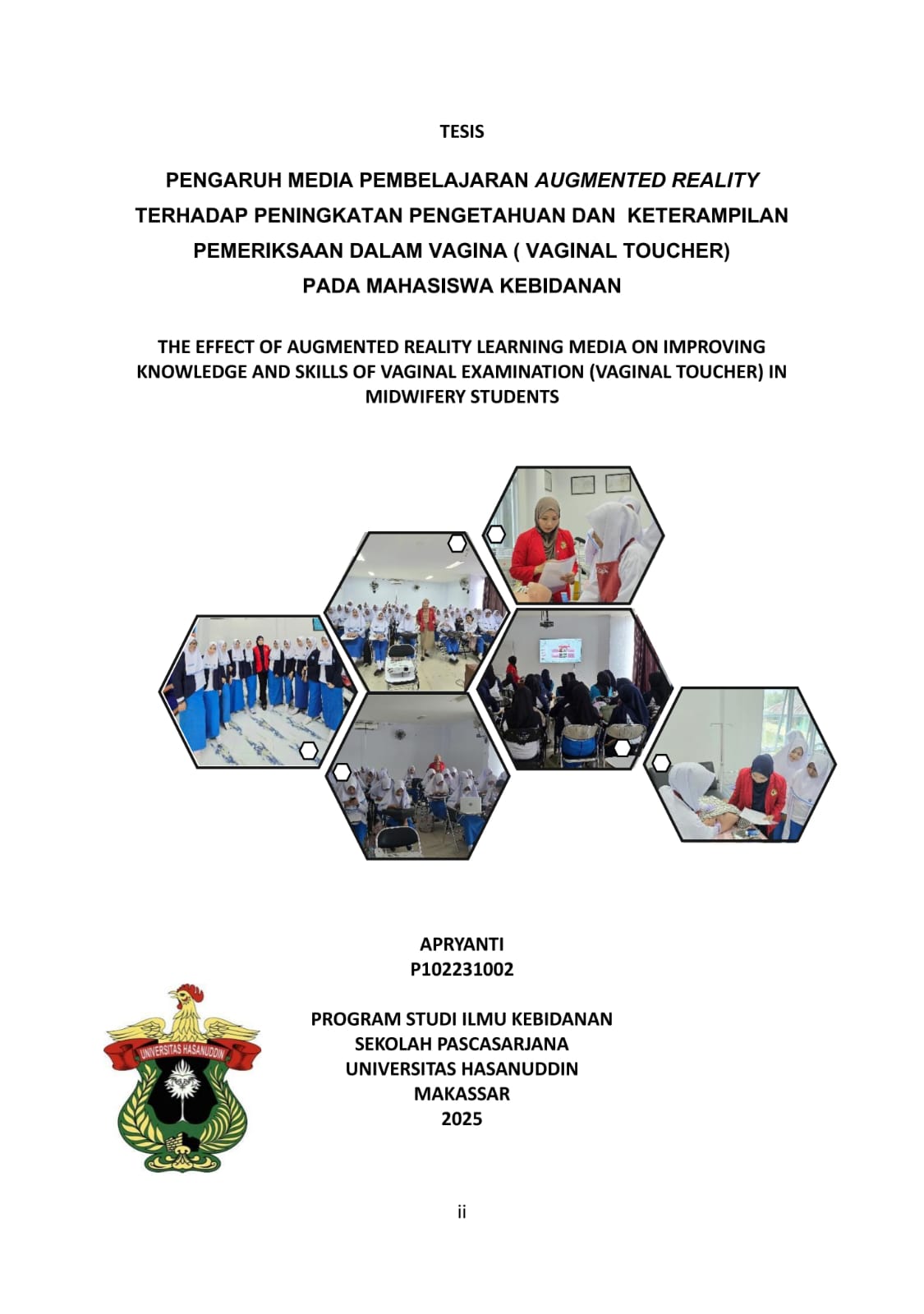 APRIYANTI . PENGARUH MEDIA PEMBELAJARAN AUGMENTED REALITY TERHADAP PENINGKATAN PENGETAHUAN DAN KETERAMPILAN PEMERIKSAAN DALAM VAGINA ( VAGINAL TOUCHER) PADA MAHASISWA KEBIDANAN (dibimbing oleh Mardiana Ahmad dan Syarifuddin ). Latar Belakang : Angka Kematian Ibu (AKI) masih menjadi isu prioritas dalam pembangunan kesehatan di Indonesia, sehingga pendidikan kebidanan dituntut untuk menghasilkan lulusan yang kompeten, khususnya dalam keterampilan klinis seperti pemeriksaan dalam vagina (vaginal toucher). Augmented Reality (AR) memberikan solusi pembelajaran interaktif yang mampu meningkatkan pengetahuan dan keterampilan mahasiswa kebidanan. Tujuan : menganalisis pengaruh media pembelajaran Augmented Reality terhadap peningkatan pengetahuan dan keterampilan mahasiswa. Metode : Quasy experiment with pretest – posttest control design group. Teknik pengambilan sampel menggunakan purposive sampling menggunakan rumus Slovin dengan jumlah sebanyak 60 responden pada masing-masing kelompok intervensi dan kontrol, pada kelompok intervensi diberikan media Augmented Reality dan kelompok kontrol diberikan media Phantom Hasil : hasil uji statistik pada kelompok intervensi setelah pre-test, dan post-tets diperoleh nilai p=0.000 (p<0.05), maka secara statistik terdapat pengaruh media pembelajaran augmented reality terhadap peningkatan pengetahuan pada kelompok Intervensi, dan hasil uji statistik pada ketrampilan mahasiswa pada kelompok intervensi diperoleh nilai p=0.000 (p<0.05), maka secara statistik terdapat pengaruh media pembelajaran augmented reality terhadap peningkatan keterampilan pemeriksaan dalam pada vagina (Vaginal toucher) Kesimpulan : Media Augmented Reality pemeriksaan dalam vagina berpengaruh terhadap peningkatan pengetahuan dan keterampilan mahasiswa.