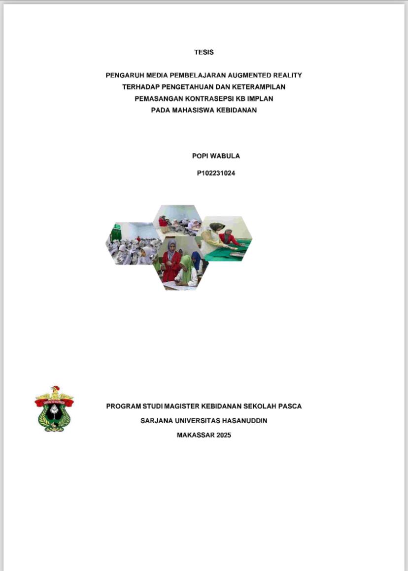 ABSTRAK Popi Wabula. Pengaruh Media Pembelajaran Augmented Reality (AR) Terhadap Pengetahuan dan Keterampilan Pemasangan Kontrasepsi KB Implan Pada Mahasiswa Kebidanan. di Bimbing Oleh Mardiana Ahmad dan Syafruddin Syarif Latar Belakang Kemajuan teknologi digital telah membuka peluang pemanfaatan media pembelajaran inovatif seperti Augmented Reality (AR) dalam dunia pendidikan kebidanan. Penggunaan AR dinilai mampu meningkatkan pemahaman konseptual dan keterampilan praktis mahasiswa, khususnya dalam pemasangan kontrasepsi KB Implan yang selama ini menghadapi keterbatasan media dan kurangnya ketertarikan mahasiswa dalam proses pembelajaran. Tujuan: Menganalisis pengaruh media pembelajaran Augmented Reality terhadap peningkatan pengetahuan dan keterampilan mahasiswa kebidanan dalam pemasangan kontrasepsi KB Implan. Metode: Penelitian ini menggunakan metode Research and Development (R&D) dengan desain quasi experiment Nonequivalent Control Group Design. Sampel terdiri dari dua kelompok intervensi (51 responden yang menggunakan media AR) dan kelompok control (51 responden yang menggunakan metode konvensional) metode yang digunakan meliputi kuesoner untuk mengkur pengetahuan dan daftar tilik untuk mengukur keterampilan dan analisis data menggunakan uji Wilcoxon dan Mann-Whitney. Hasil:Terdapat peningkatan yang signifikan pada pengetahuan dan keterampilan setelah intervensi baik pada kelompok intervensi maupun control. Uji Wilcoxon menunjukan ada perbedaan pengetahuan antarak kelompok yang menggunakan media augmented reality diperoleh nilai p = 0,000 (p<0.05) sementara untuk kelompok control yang menggunakan pembelajaran phantom diperoleh nilai p = 0,000 (p<0,05). Hasil Uji Wilcoxon menunjukan ada perbedaan keterampilan antarak kelompok yang menggunakan media augmented reality diperoleh nilai p = 0,000 (p<0,05) dan control menggunakan pembelajaran phantom diperoleh nilai p = 0,000 (p<0,05). Uji Mann-Whitney menunjukkan perbedaan yang signifikan antara kelompok yang menggunakan media augmented reality diperoleh nilai p= 0,000 (p<0,05) dan kontrol menggunakan pembelajaran dengan phantom diperoleh nilai p=0,568 (p=0,05) baik dalam pengetahuan maupun keterampilan. Kesimpulan: Media pembelajaran berbasis Augmented Reality terbukti efektif secara signifikan dalam meningkatkan pengetahuan dan keterampilan mahasiswa kebidanan terkait pemasangan kontrasepsi KB Implan dibandingkan dengan metode pembelajaran konvensional Kata Kunci: Augmented Reality, Pengetahuan, Keterampilan, KB Implan, Mahasiswa Kebidanan